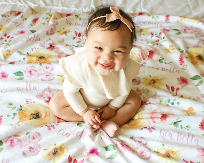 This personalized swaddle set is a bright and airy floral pattern with pink and yellow watercolor flowers. Choose from swaddle blankets, bow headbands and a knot hat. Add baby’s name in your choice of our fonts.