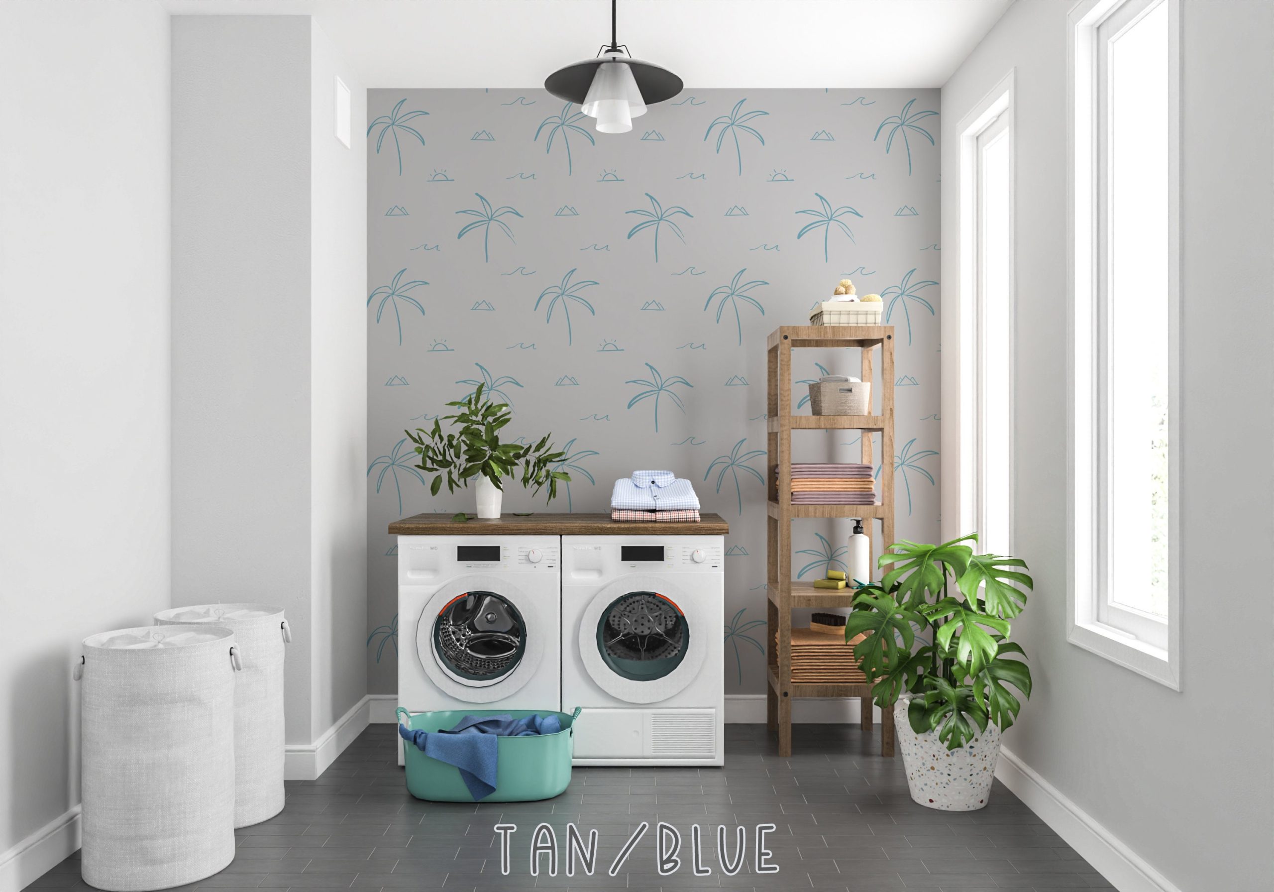 Beachy Palm Tree Coastal Wallpaper, Grey Blue Tropical, Peel Stick Removable, Large Print Home Decor Living Room Bedroom Nursery Traditional
