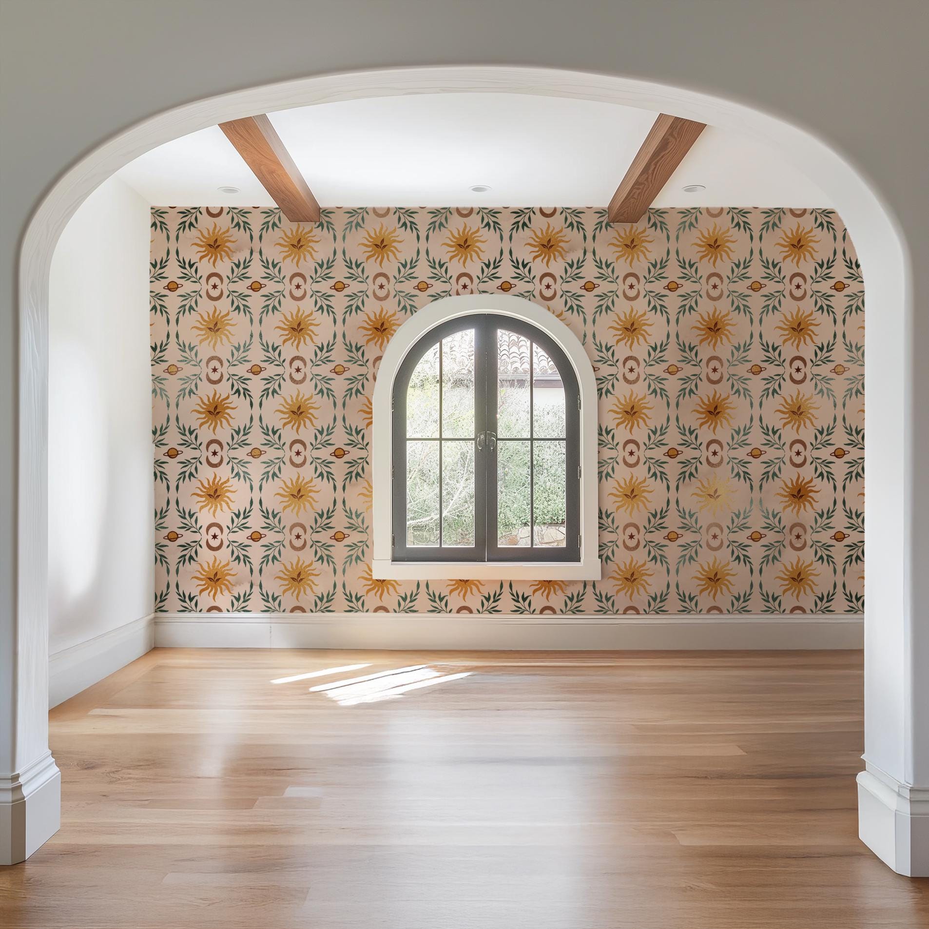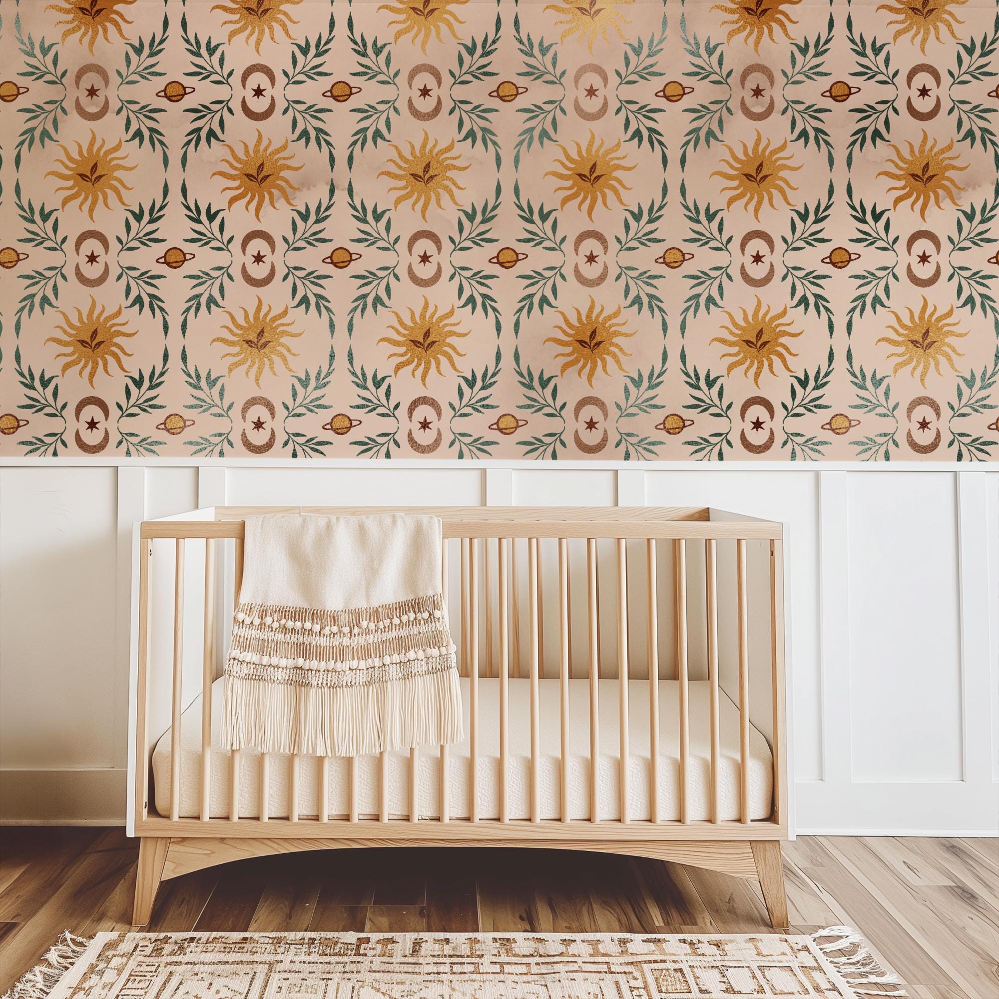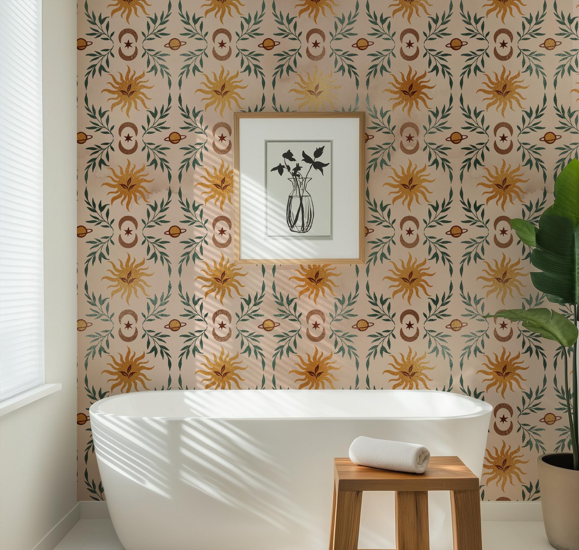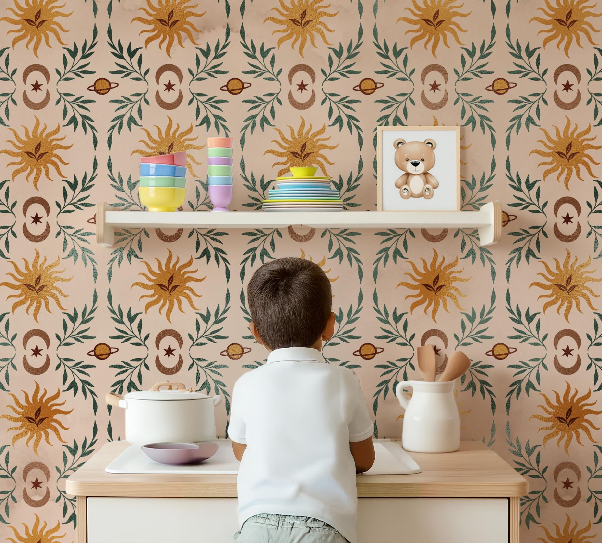 Celestial Sun Planets Moon Pattern Wallpaper, Peel Stick Removable, Spiritual Leafy Neutral Trendy Boho Sun Pattern