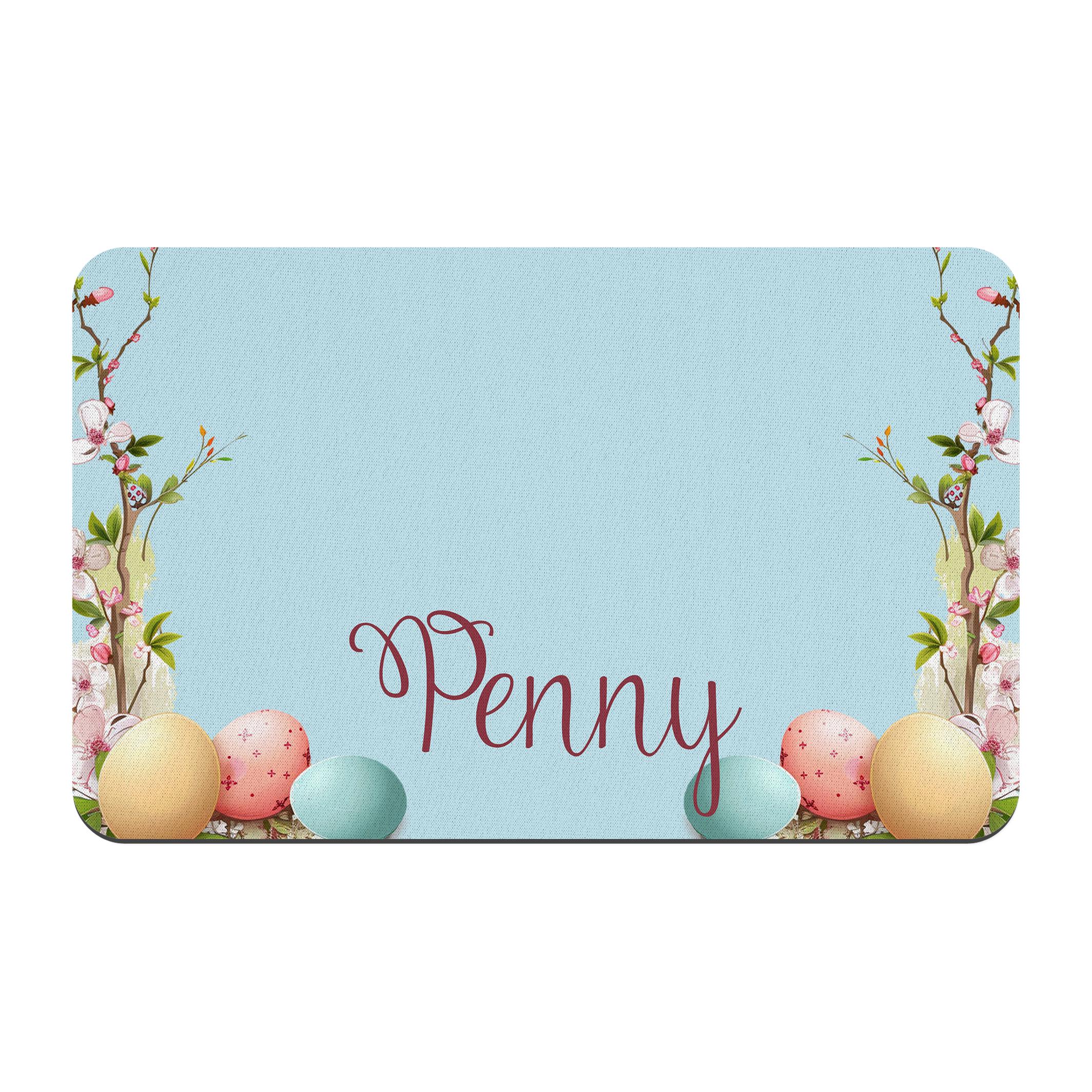 This cute Easter pet mat has adorable colored eggs and cherry blossoms with a blue background.