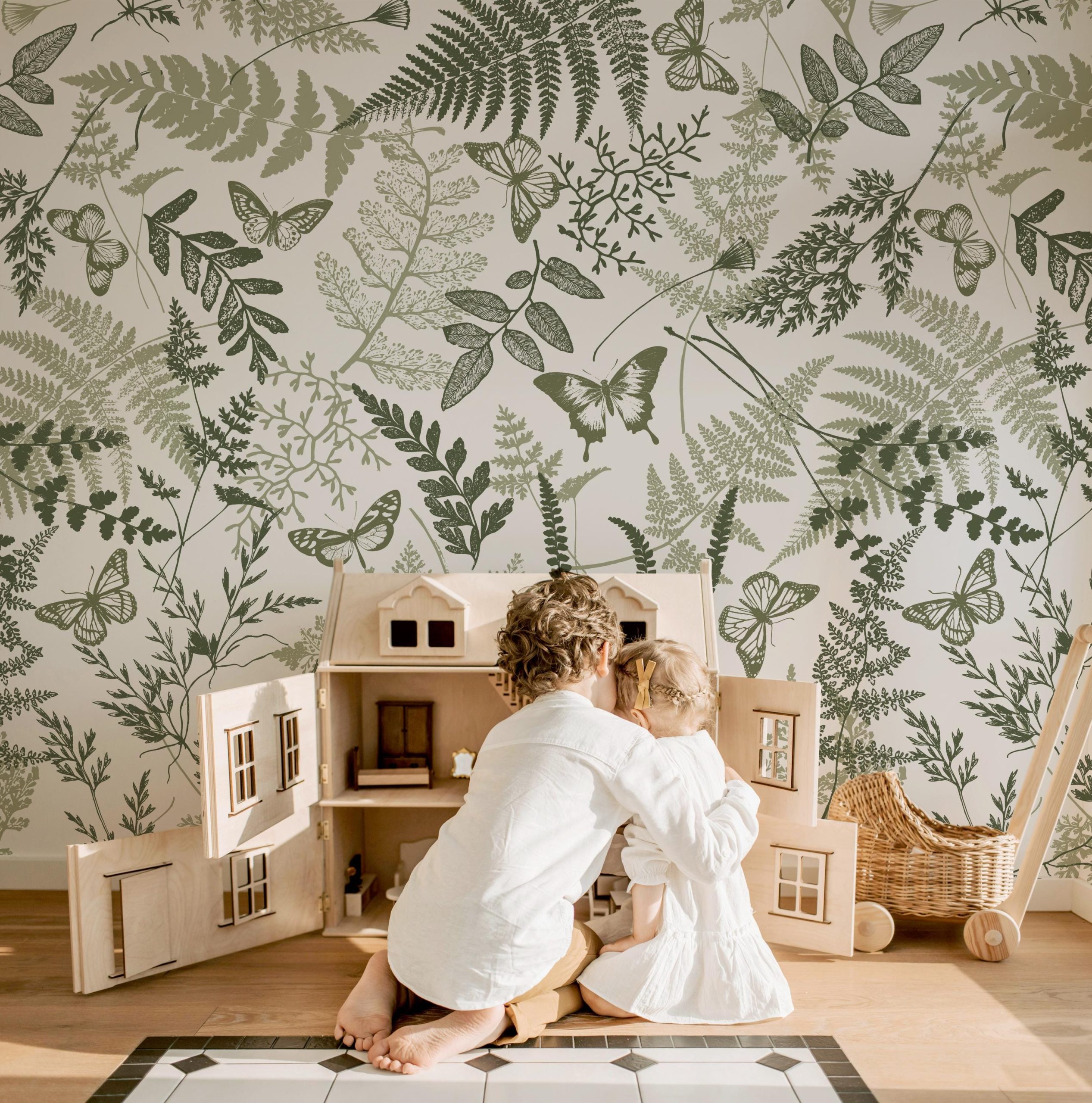 Green Botanical Pressed Wallpaper, Fern Greenery Plant Garden, Peel Stick Prepasted Traditional, Custom Dimensions Sage Botanical