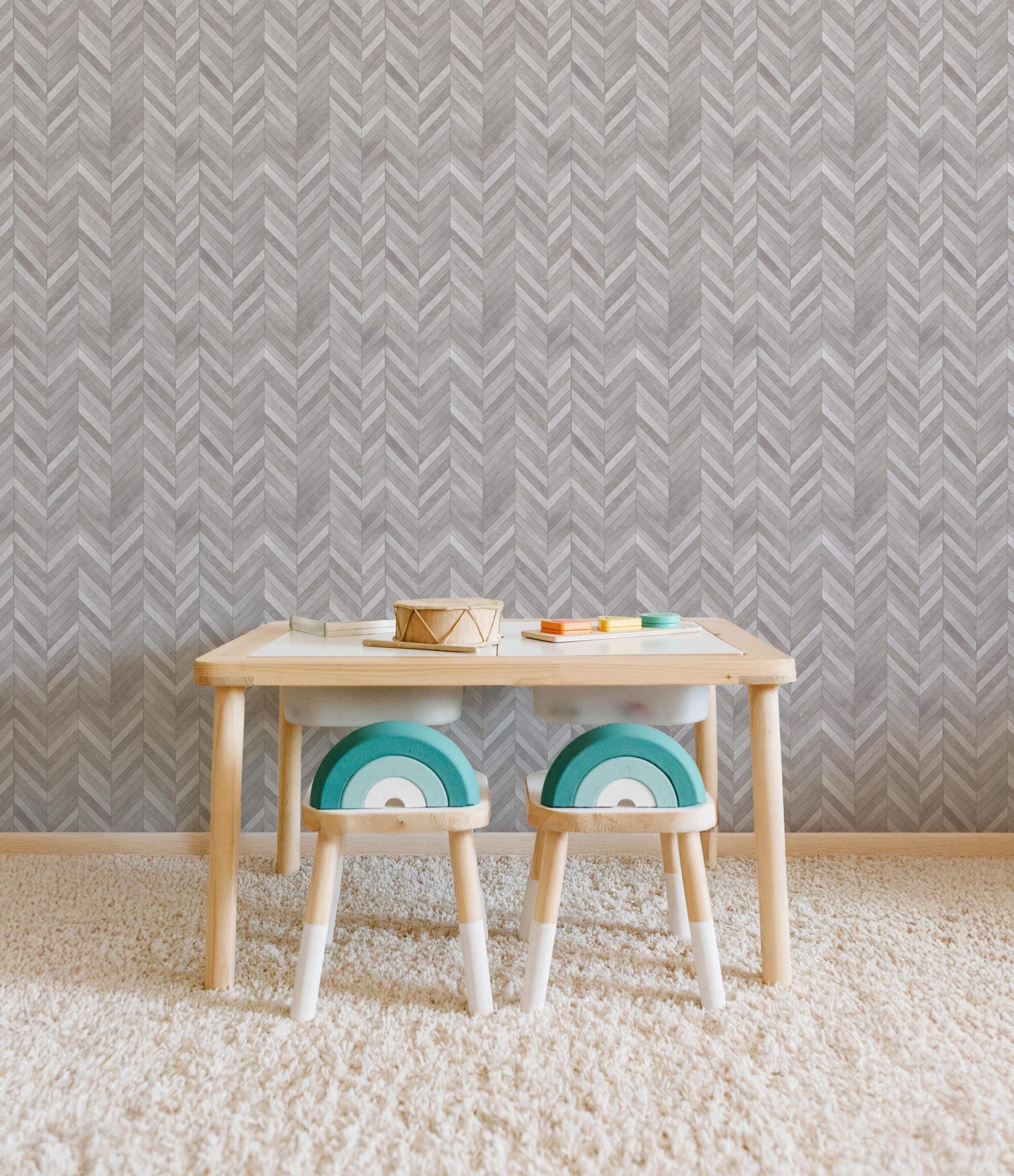 Refresh your space with the clean, contemporary look of this gray chevron peel and stick wallpaper 🧊 This faux wood mural brings subtle texture and cool elegance to any modern home, blending sleek gray tones in a classic chevron layout.