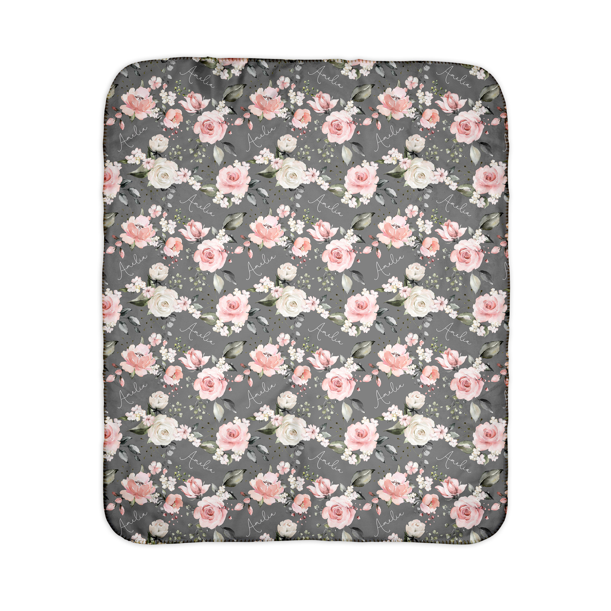 Grey Pink Soft Floral Rose Blanket / Plush Sherpa Personalized Baby Shower Gift / Hospital Newborn Photos Prop / Rosie II Collection