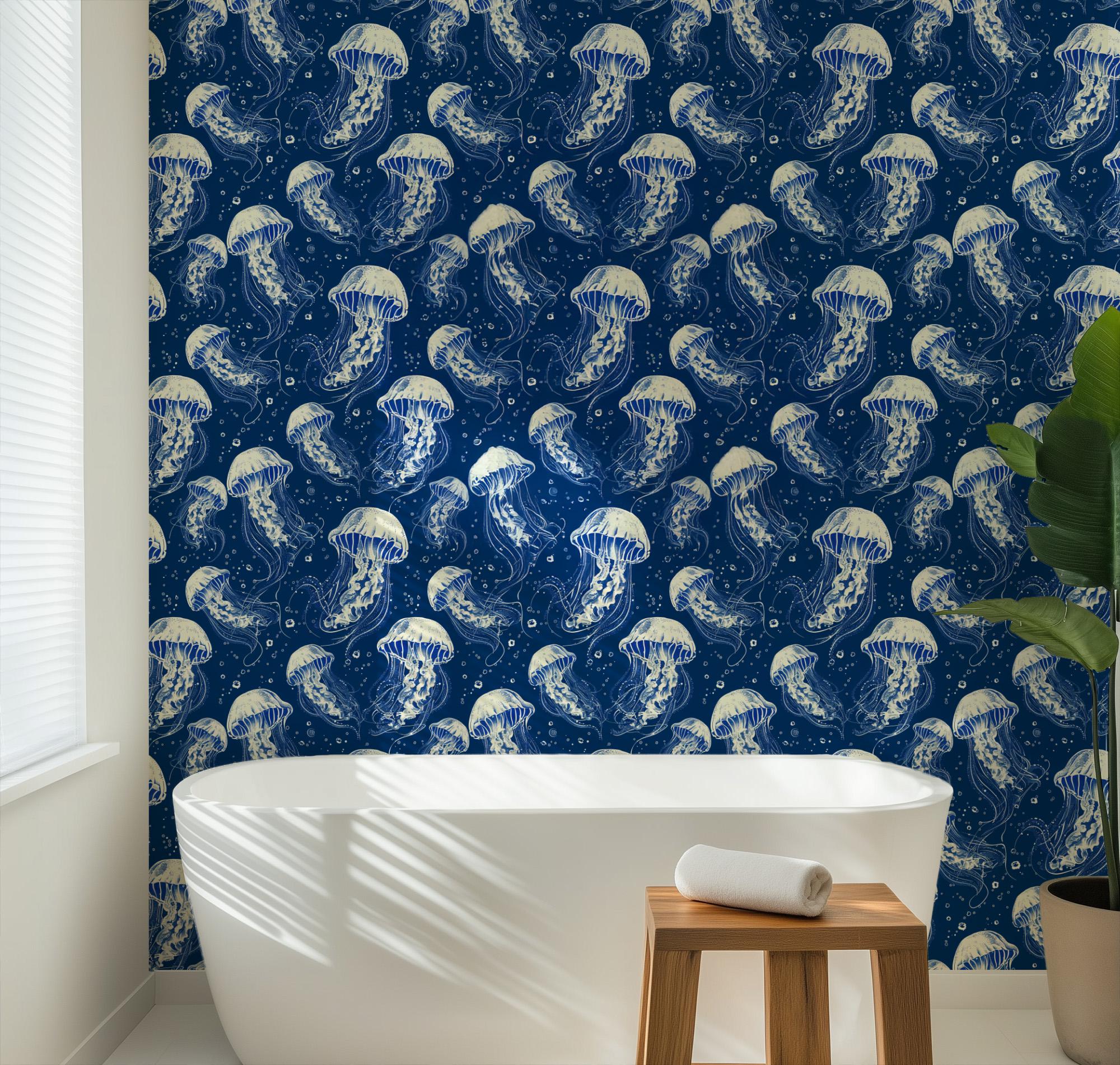 Jellyfish Dreams Wallpaper, Navy Beach Coastal Nautical Tropical, Peel and Stick Removable, Prepasted Traditional Sea Life Custom Sizes