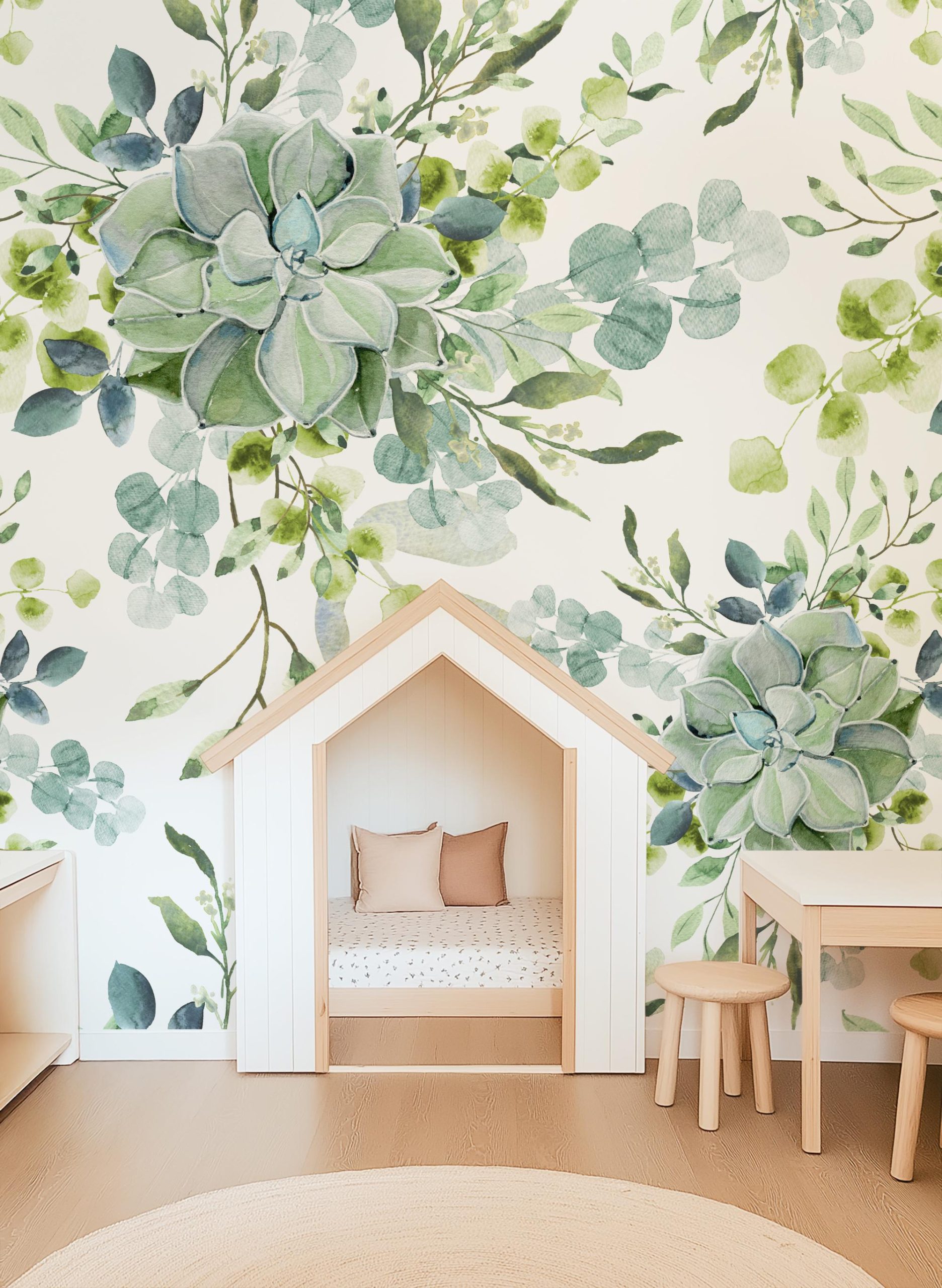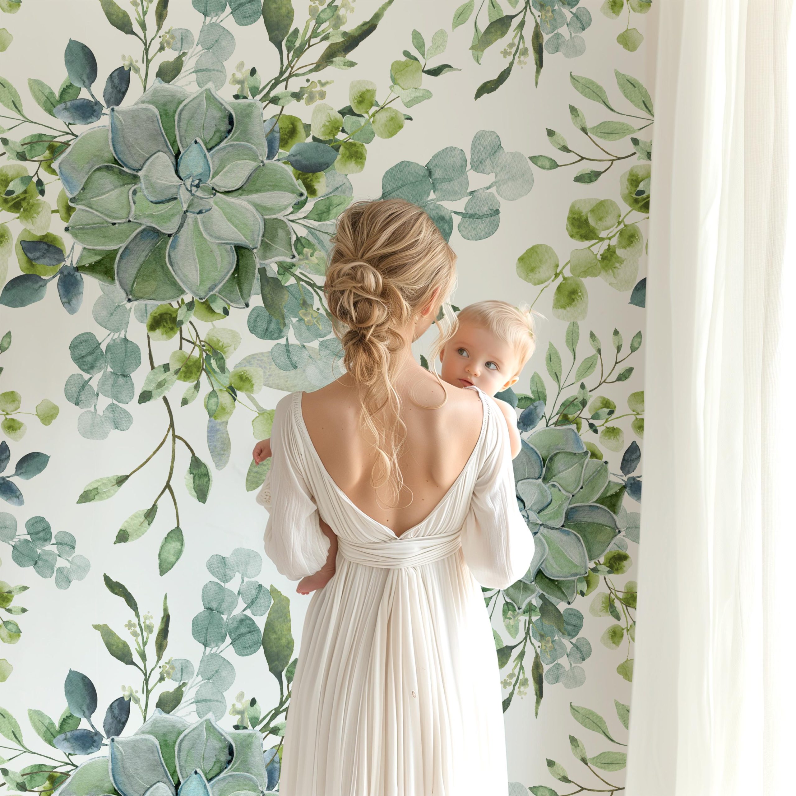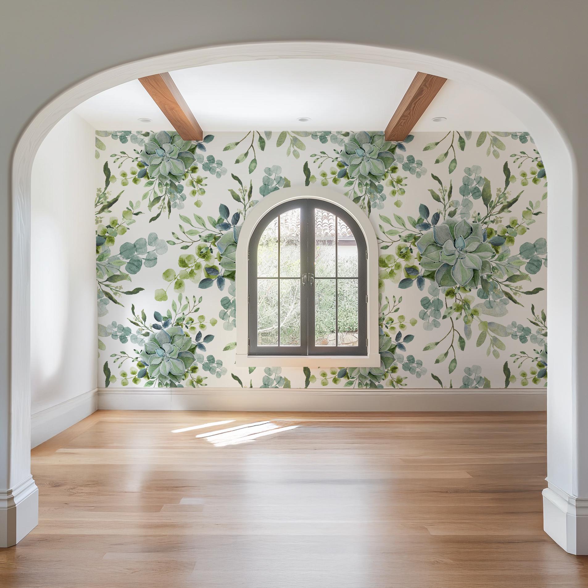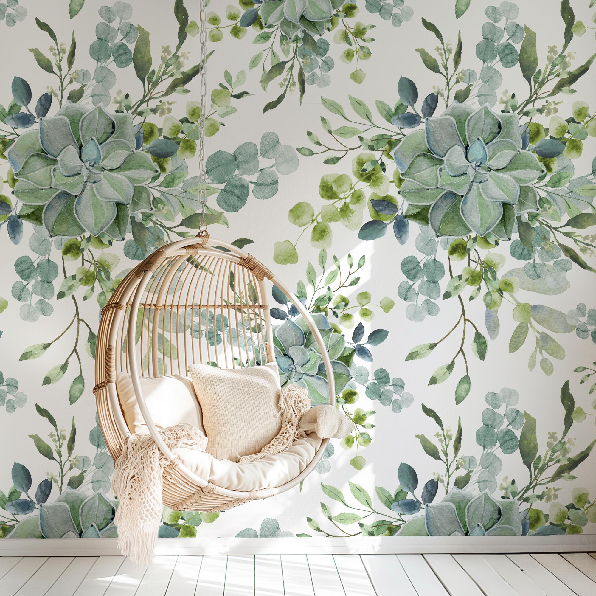 Large Scale Succulent Greenery Wallpaper, Peel and Stick Removable, Blue Green Colors Boho, Living Room Bedroom, Desert Cactus Green