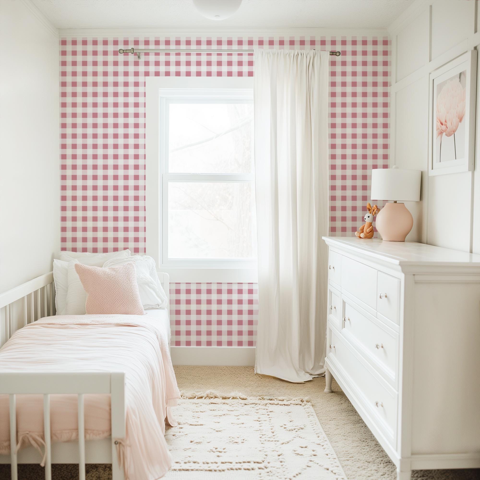 Mauve Pink Plaid Wallpaper, Vintage Shabby Chic Peel Stick, Romantic Baby Girl Room, Granny Chic Grandmillennial Coquette, Gingham Checkered