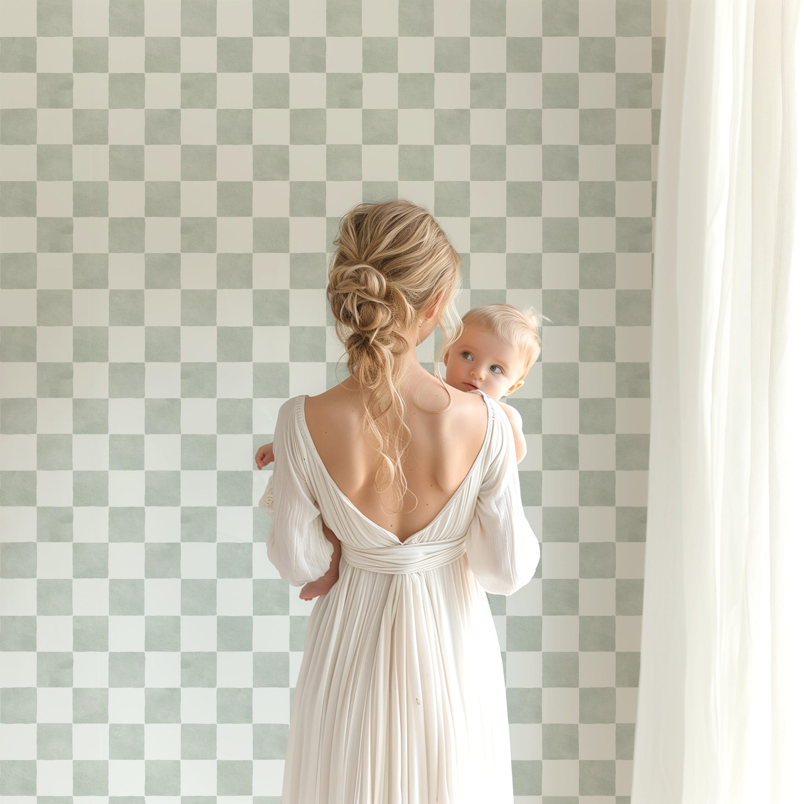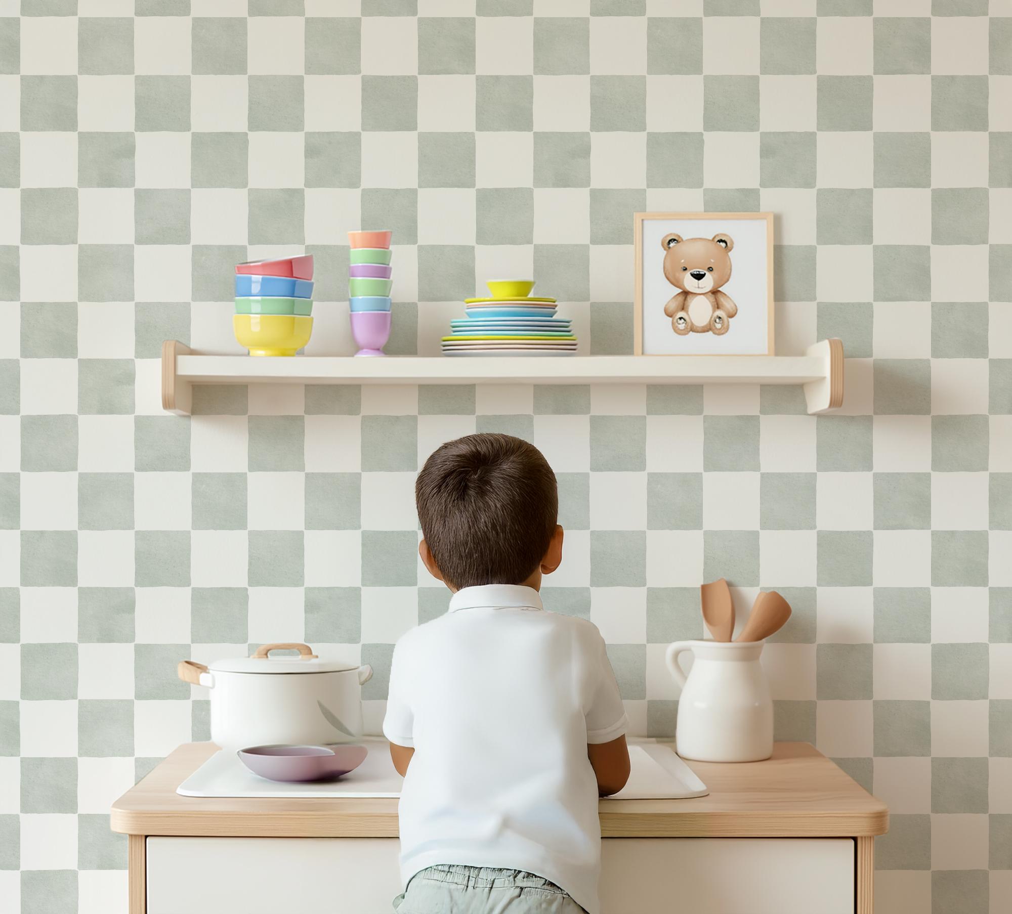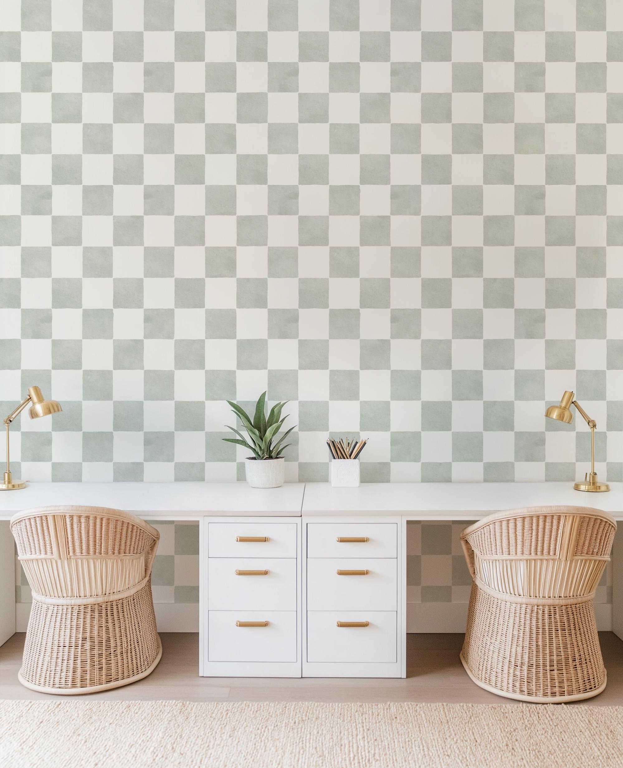 Muted Blue Checkered Wallpaper, Watercolor Peel Stick Removable, Unpasted Traditional Option, Retro Boho Check Pastel Accent Gingham