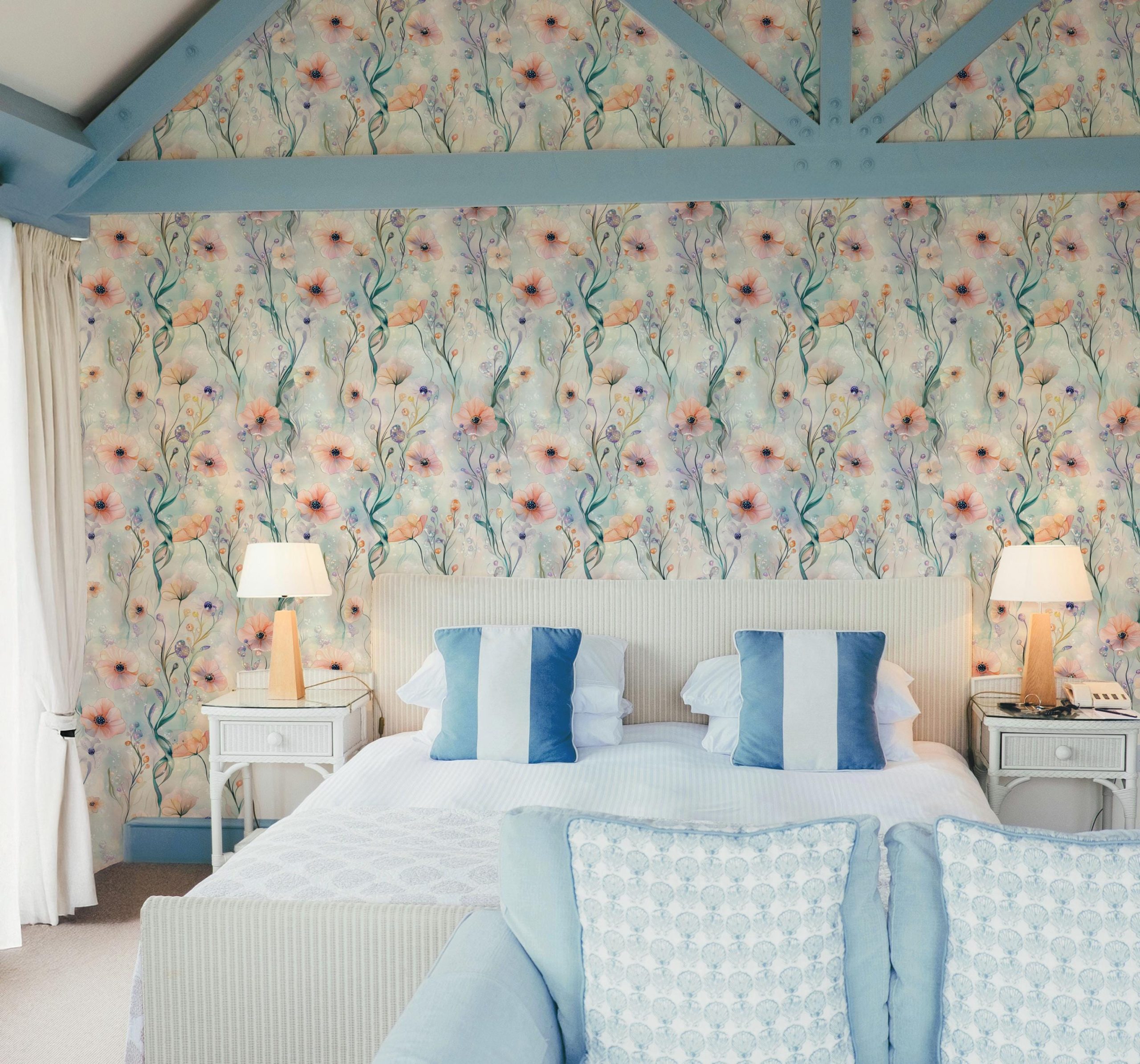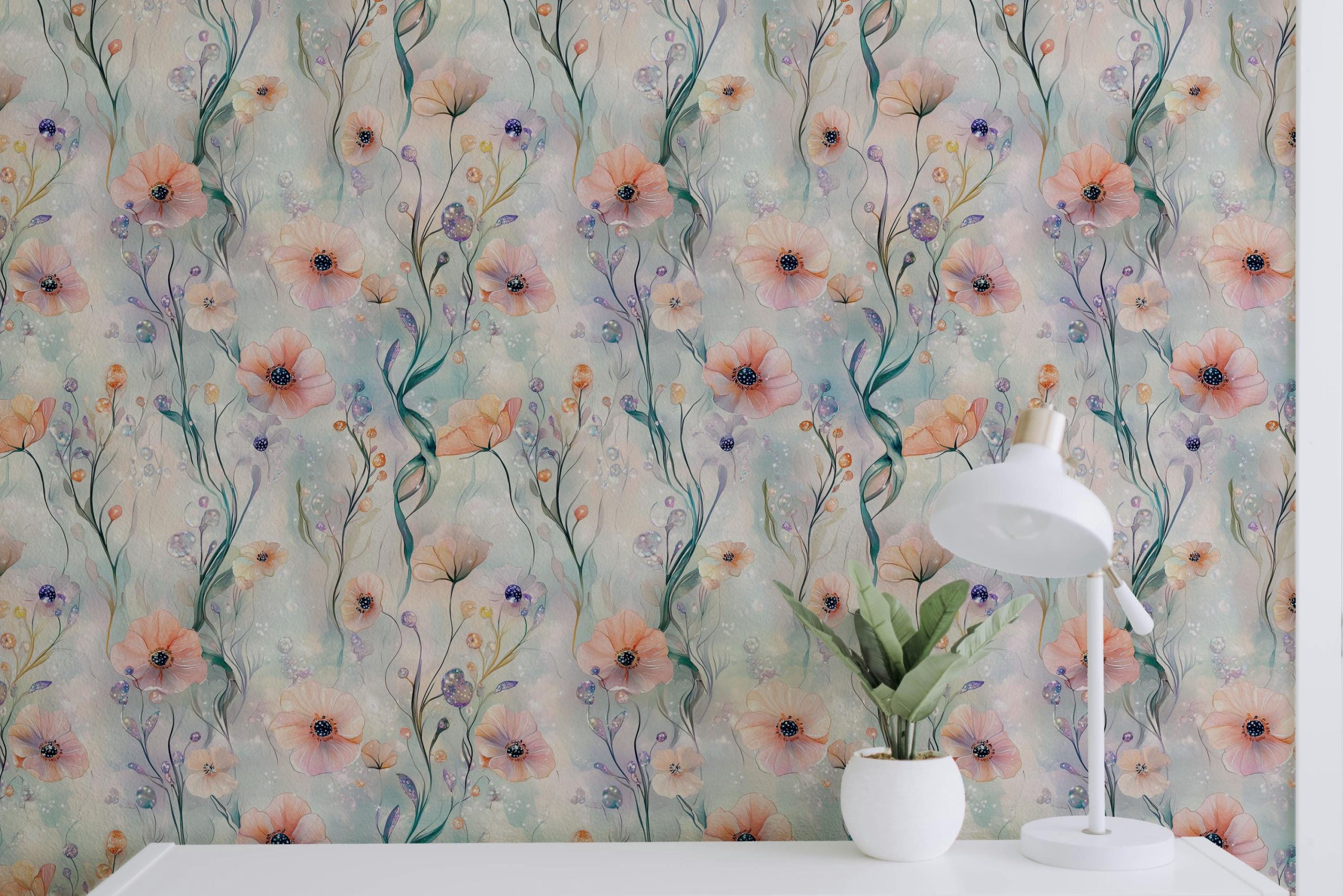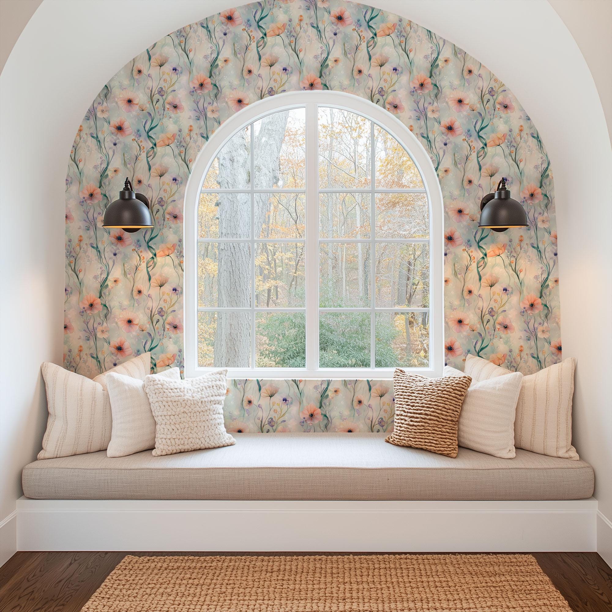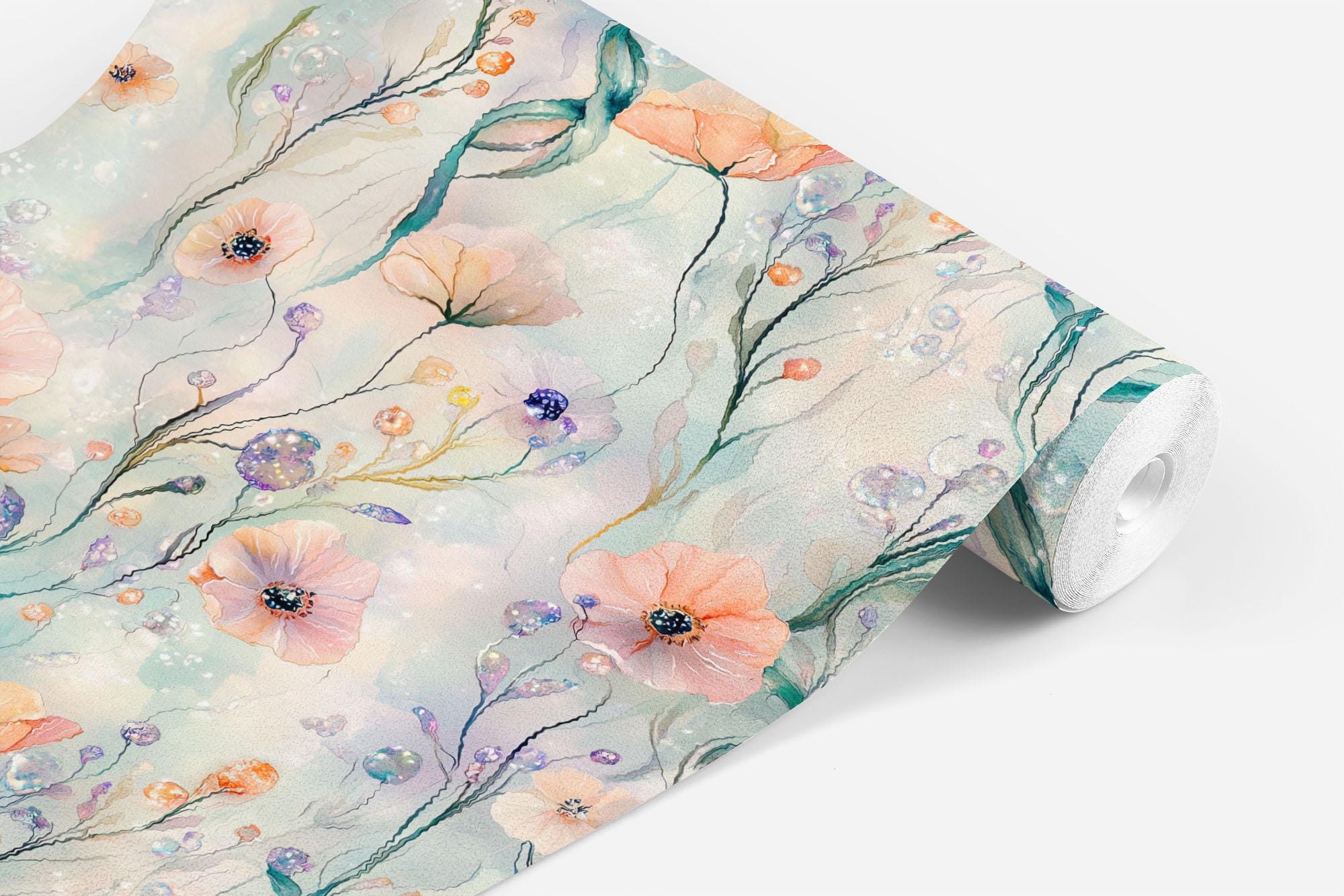Ocean Blooms Floral Wallpaper, Beach Coastal Nautical, Purple Peach Pink Hues, Peel and Stick Removable, Prepasted Traditional, Custom Sizes