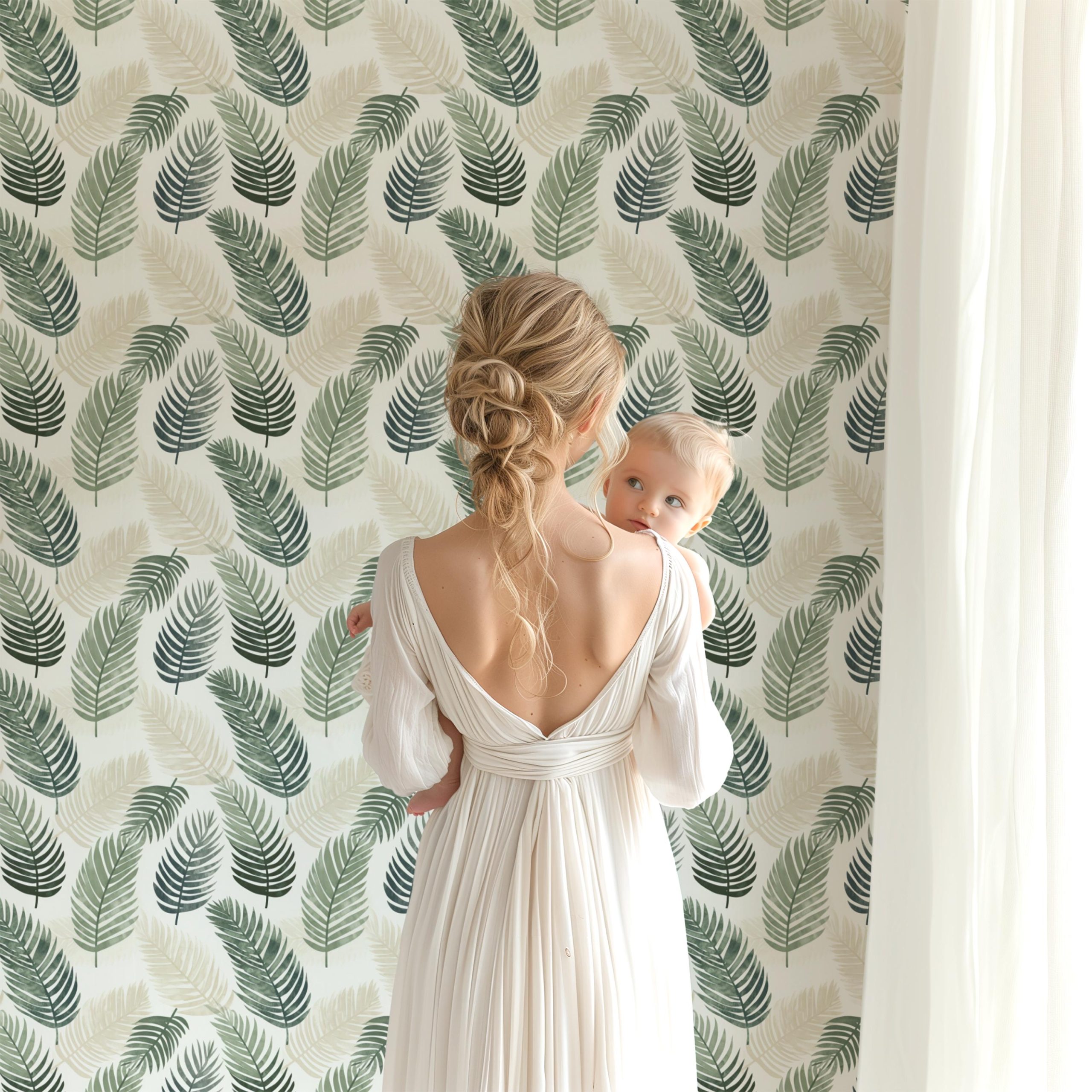 Palm Leaf Wallpaper, Fern Greenery Plant Garden, Peel Stick Prepasted Traditional, Custom Sizes Sage Green Botanical