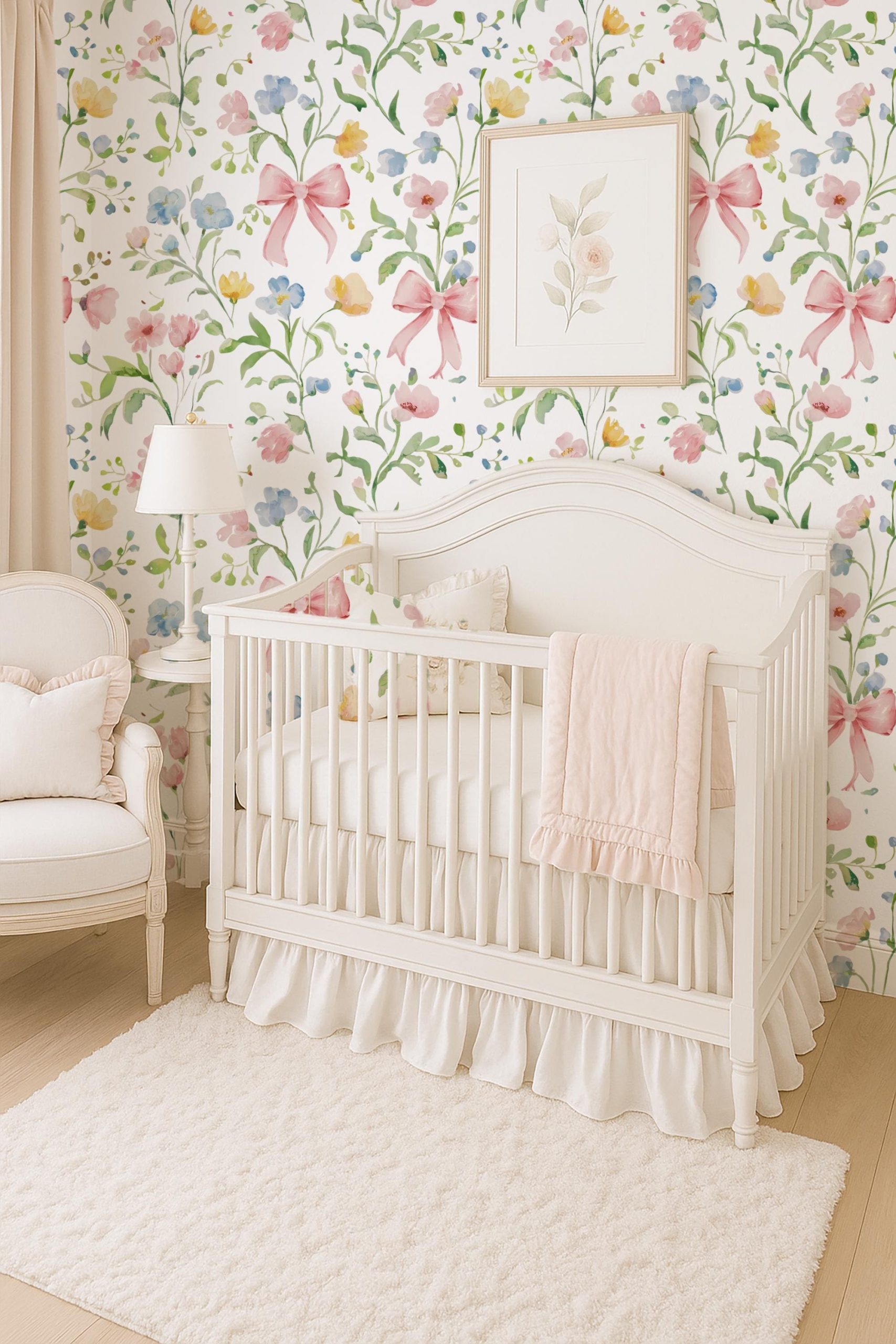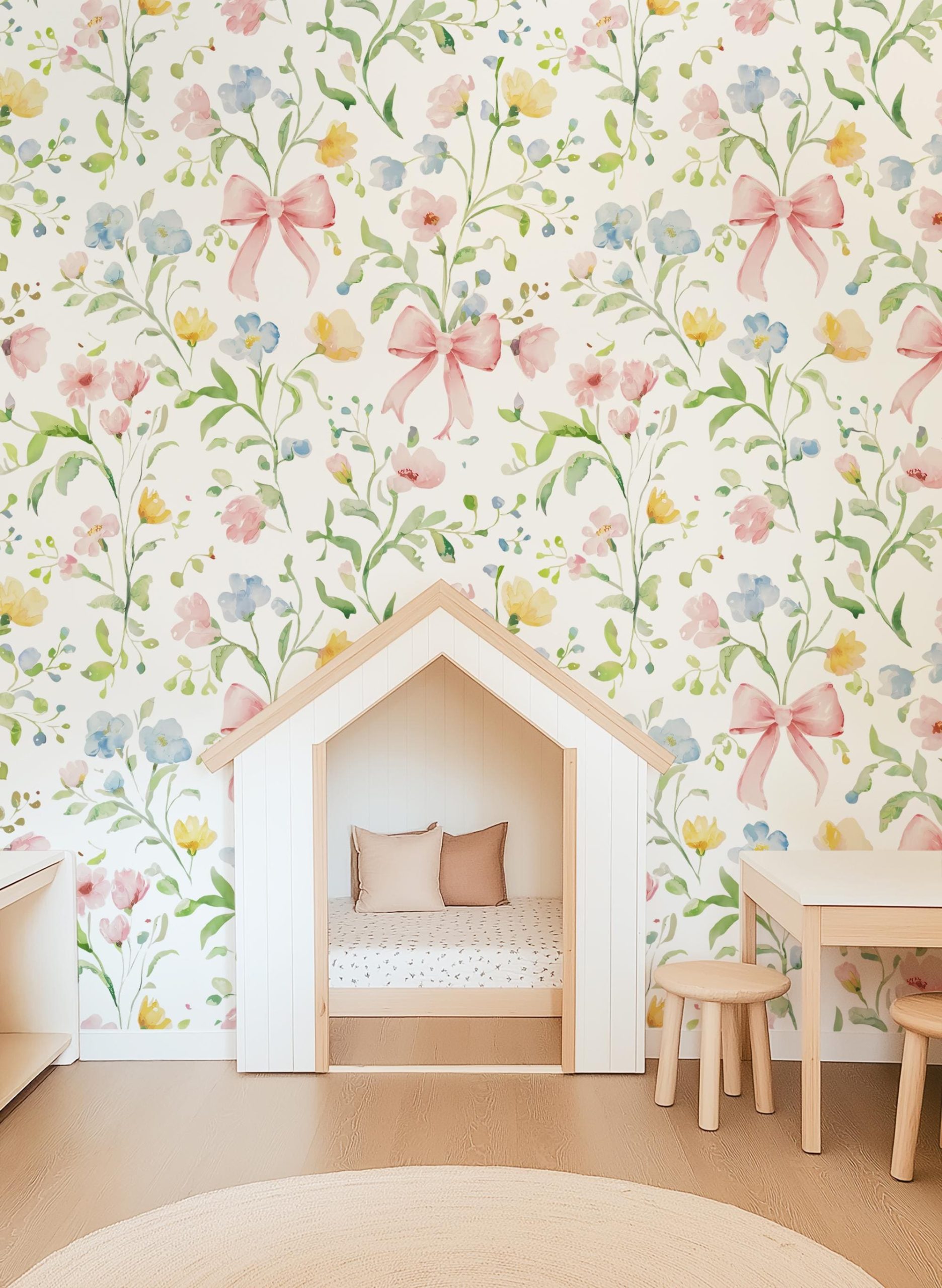 Bring storybook sweetness to your walls with this pastel floral bow wallpaper 🎀🌸 Featuring soft watercolor blooms and trailing ribbons, this peel-and-stick mural is perfect for nurseries, bedrooms, or coquette-inspired interiors.