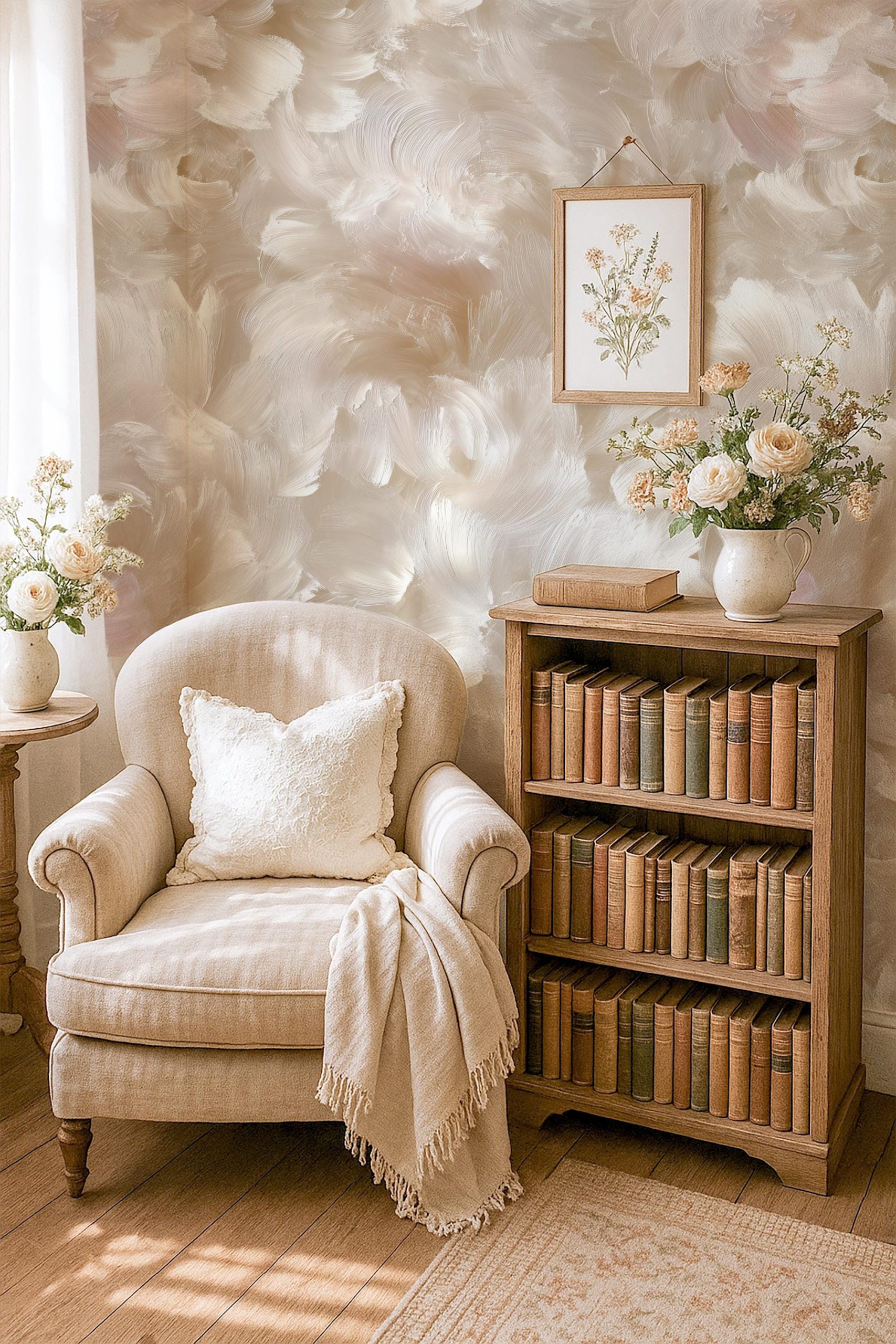 • 🖼️ Artistic Brushstroke Texture – Features soft swirls and strokes in creamy neutrals with hints of blush for a painterly, hand-painted effect.