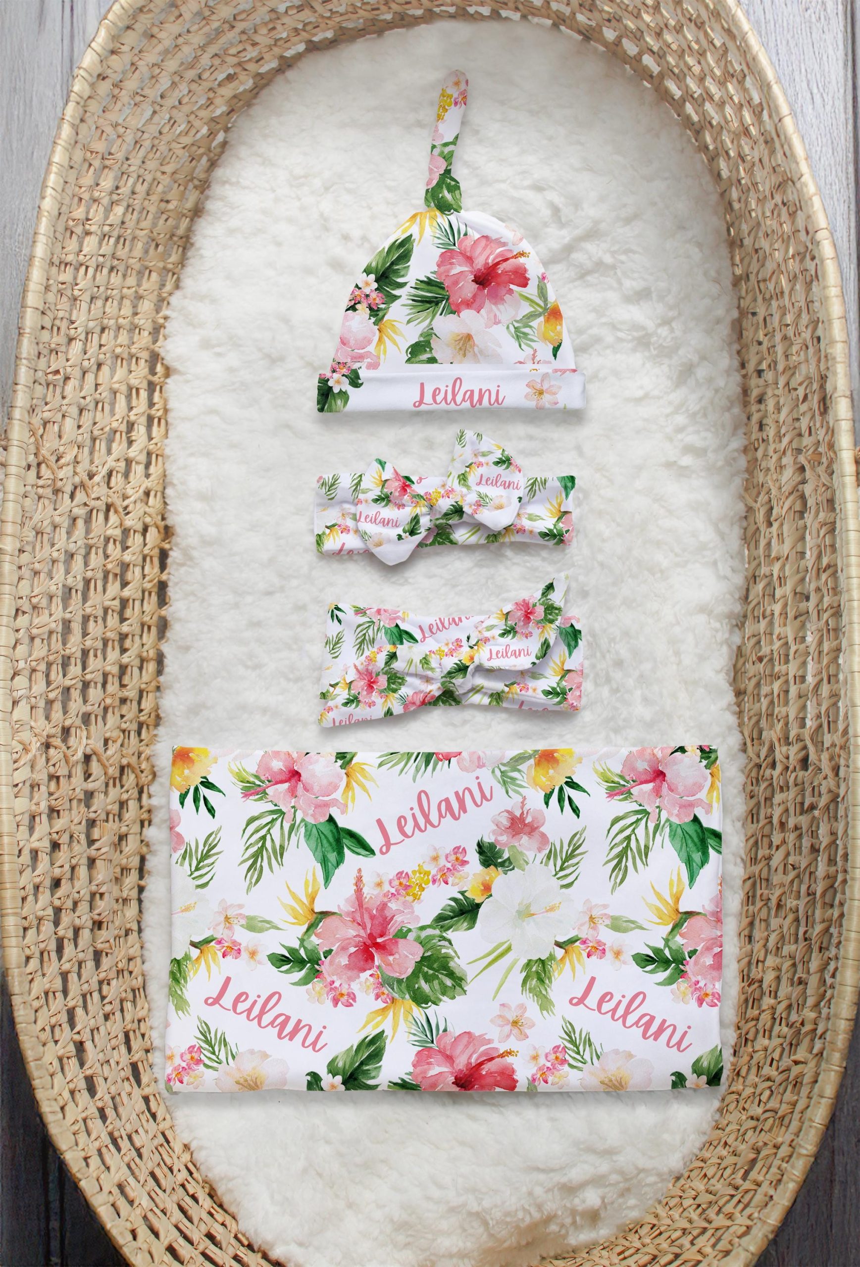 Personalize this tropical pink hibiscus flower and palm leave swaddle set with baby’s name! This makes a great personalized keepsake gift for that new special baby girl!