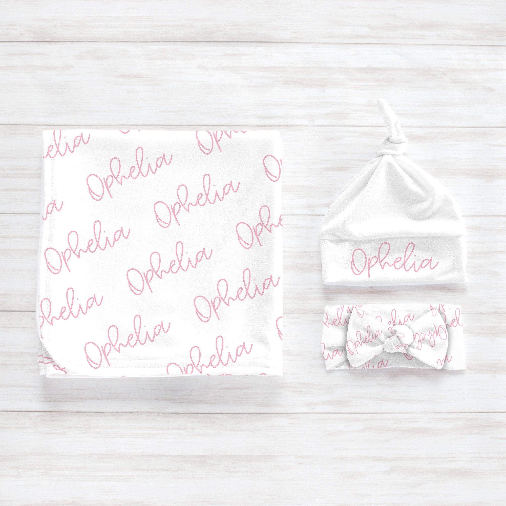 Personalized Baby Swaddle Blanket Set / Newborn Beanie Knotted Hat / Baby Shower Gift / Custom Print Name Personalize a sweet swaddle + head accessory set to bring your precious little one home from the hospital.
