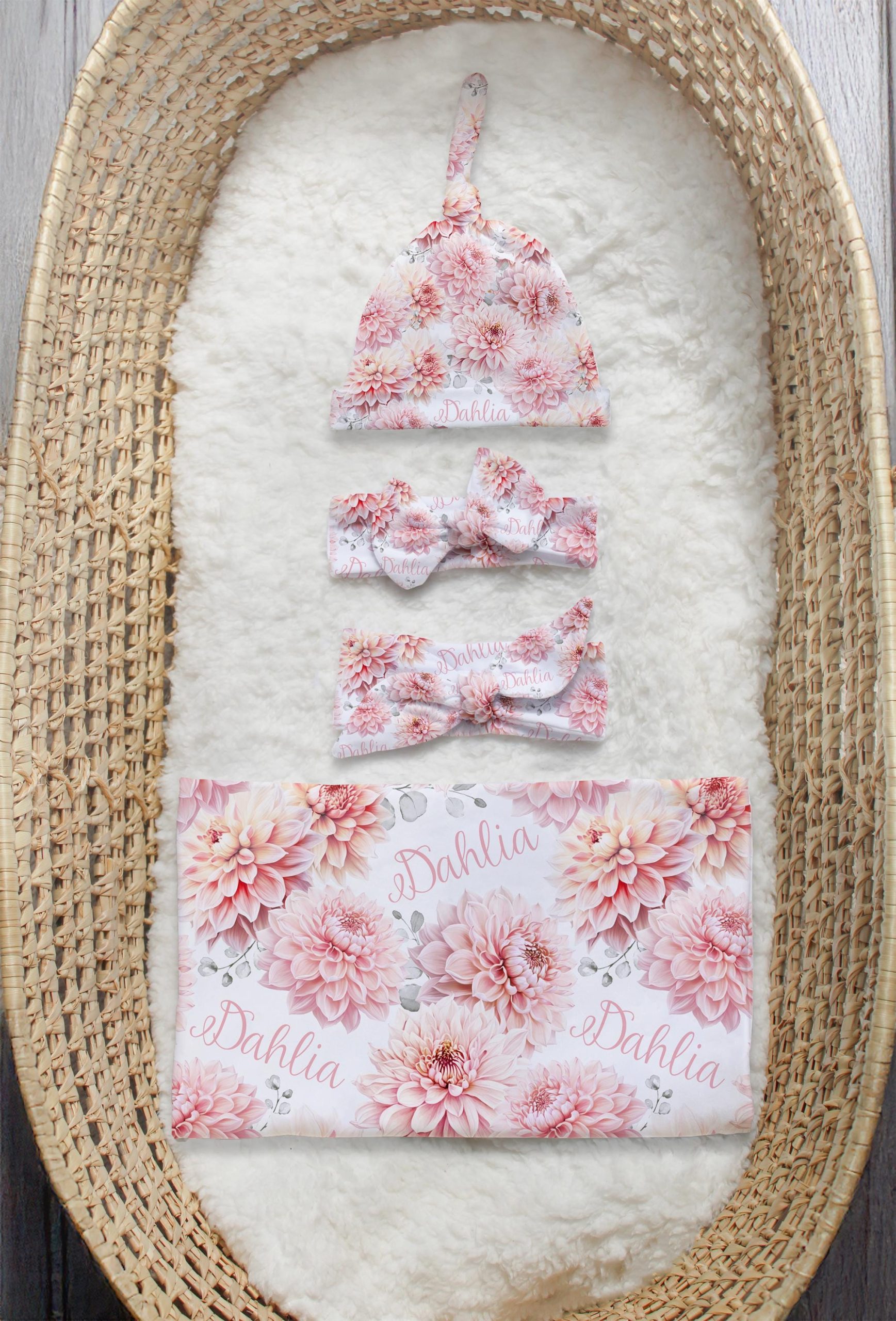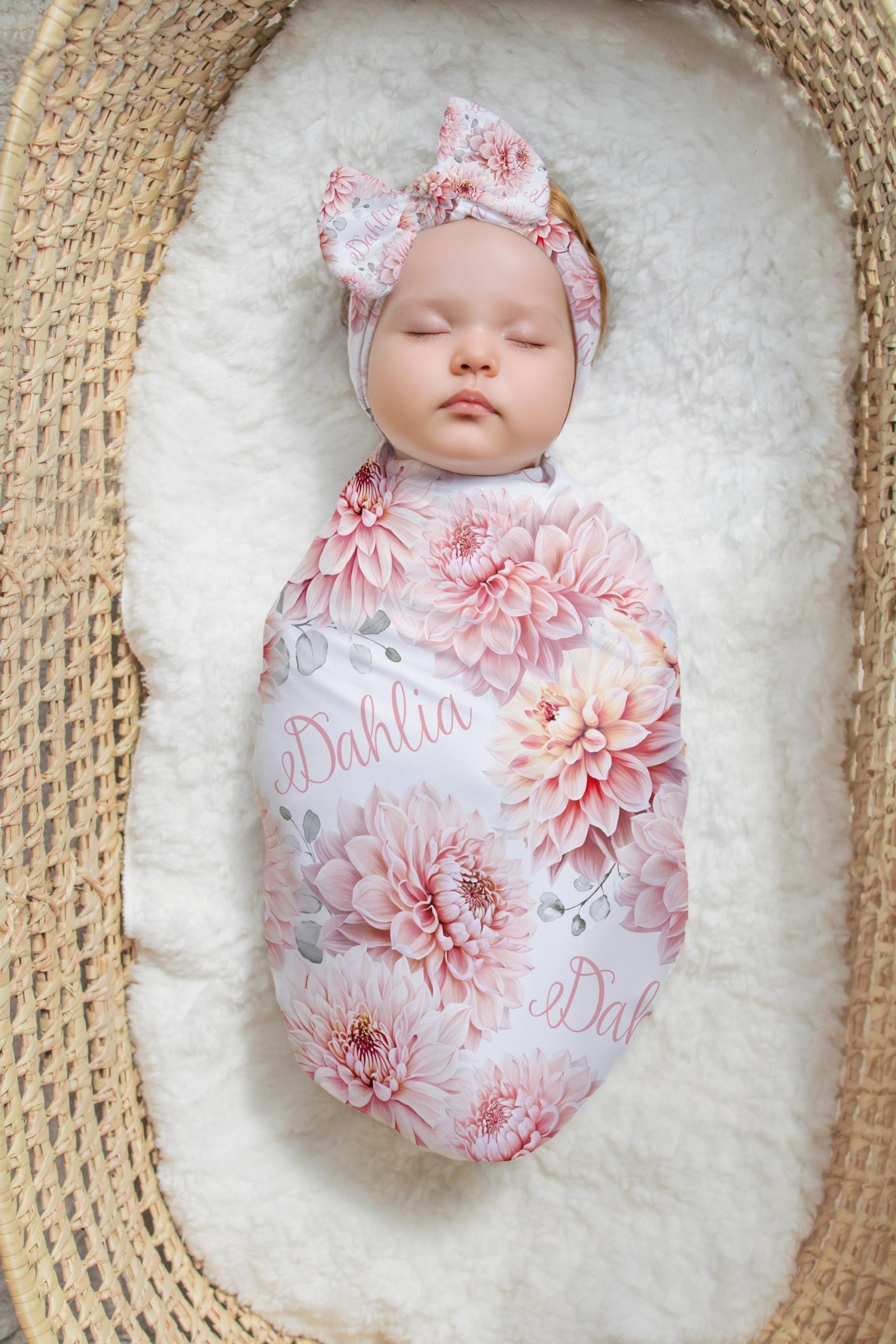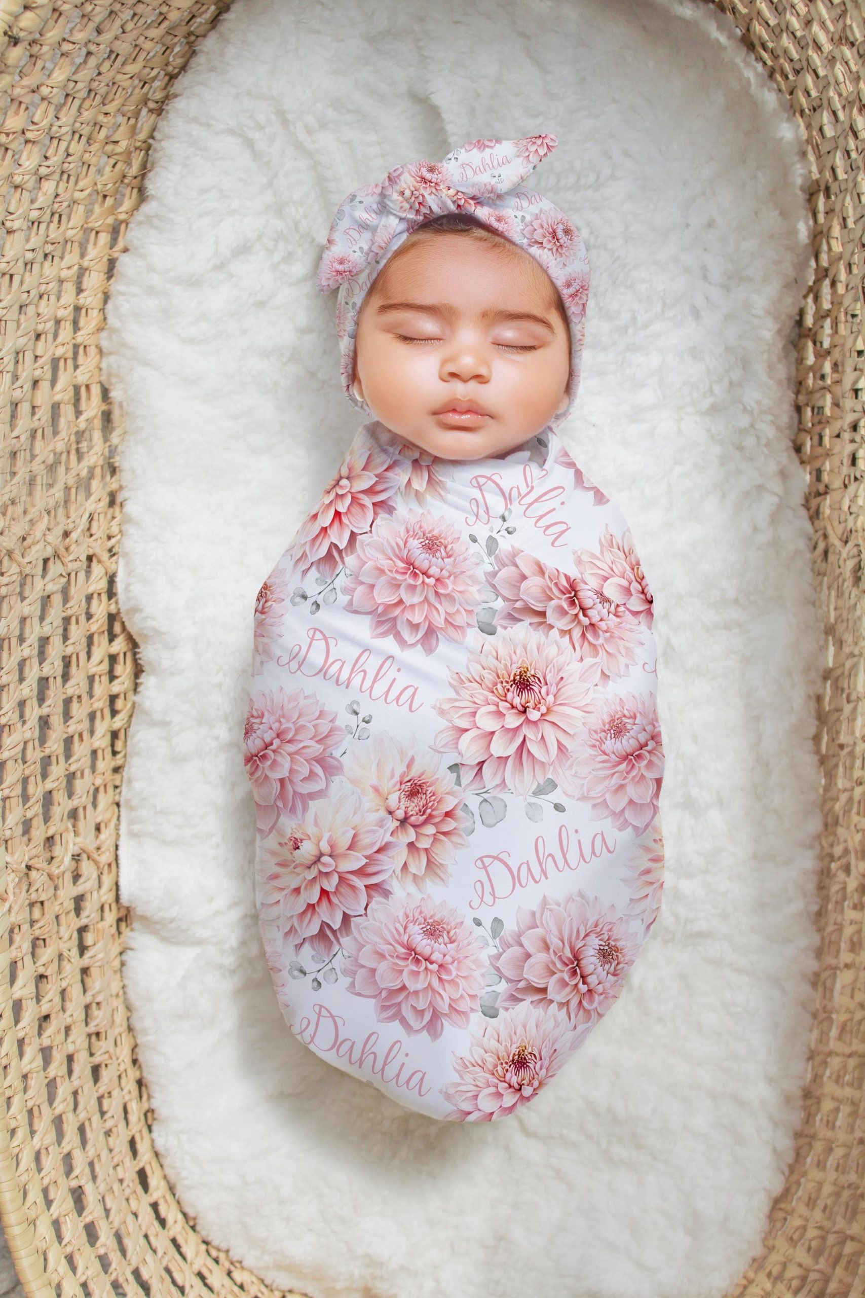 Personalized baby girl swaddle with pink dahlia flowers and eucalyptus.