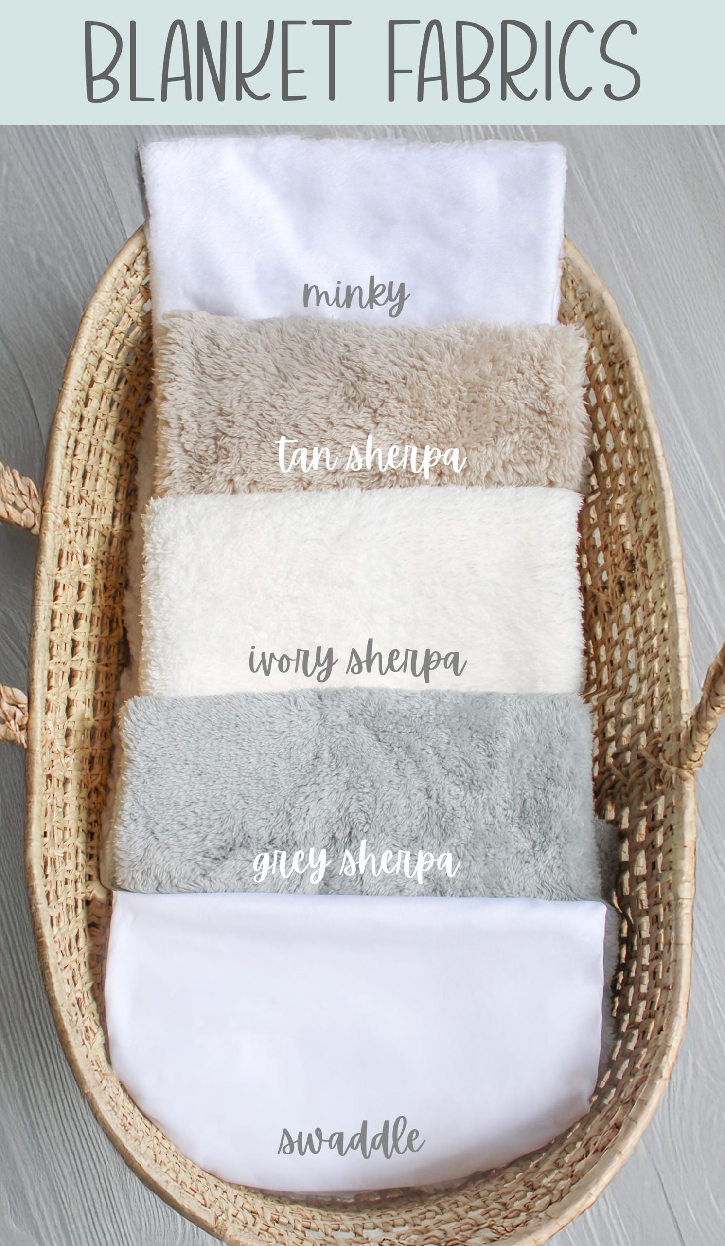 Bib, Burp Cloth, Car Seat Cover, Changing Pad Cover, Crib Sheet 28×52", Crib Sht Mini 24×38", Grey Sherpa 30×40", Grey Sherpa 50×60", Grey Sherpa 60×80", Minky Blanket 30×40", Minky Blanket 50×60", Minky Blanket 60×80", Tan Sherpa 30×40", Tan Sherpa 50×60", Tan Sherpa 60×80", White Sherpa 30×40", White Sherpa 50×60", White Sherpa 60×80"
