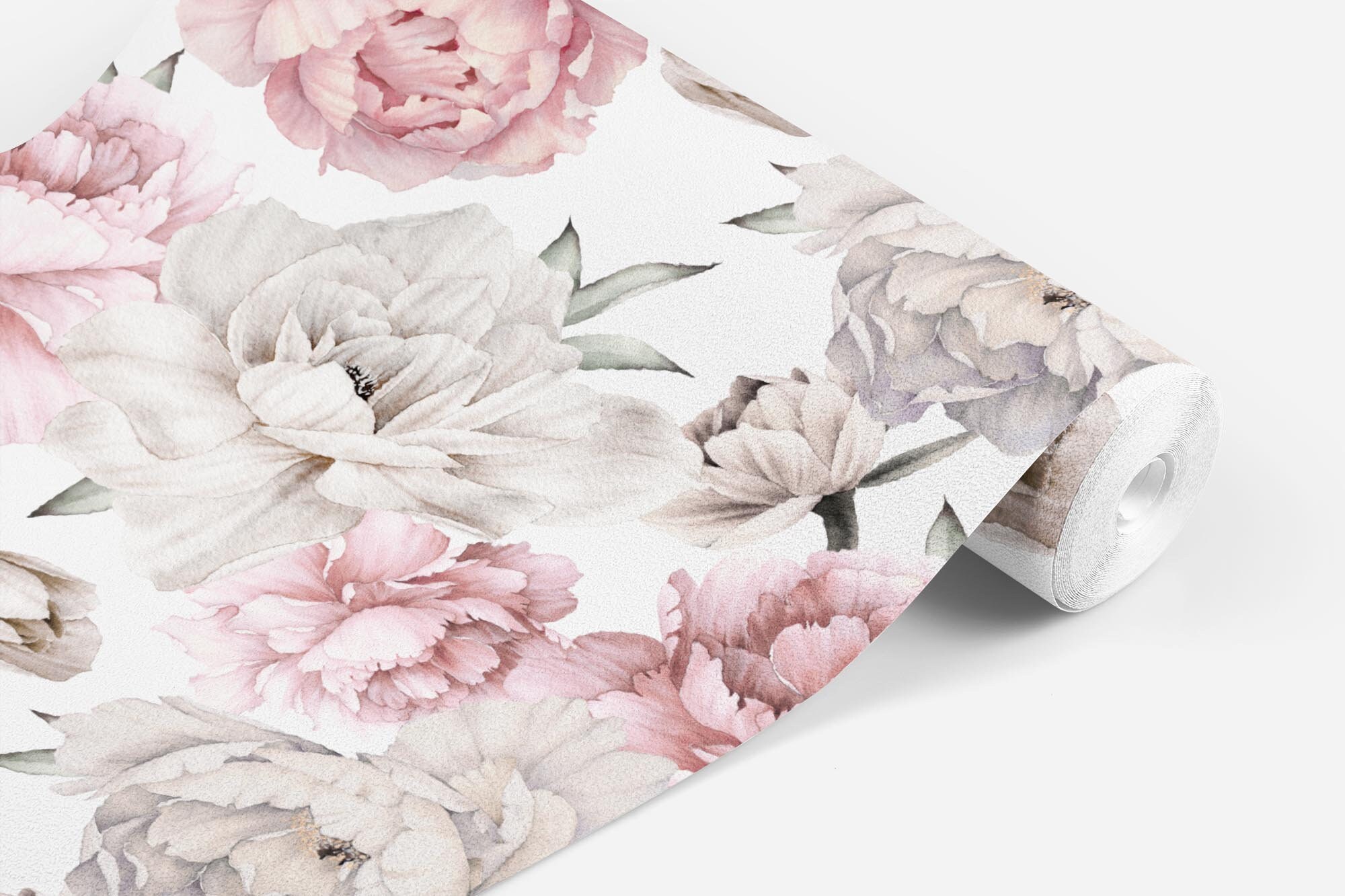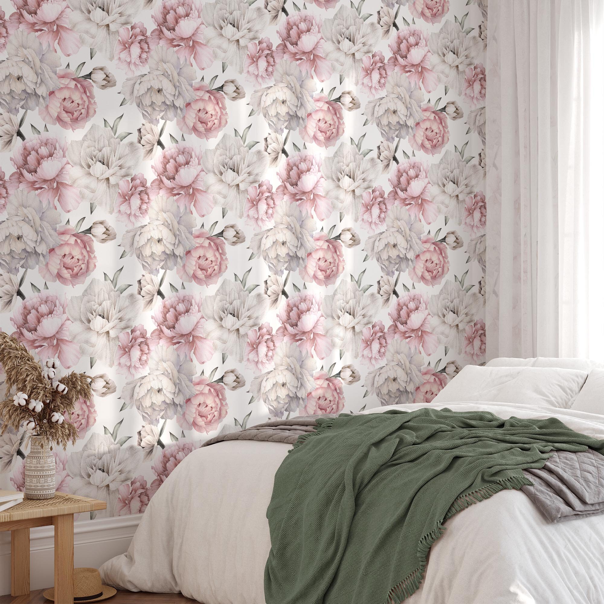 Pink Cream Peony Floral Wallpaper, Peonies Flower Garden, Peel and Stick Removable, Prepasted Traditional Nursery Mural Custom Dimensions