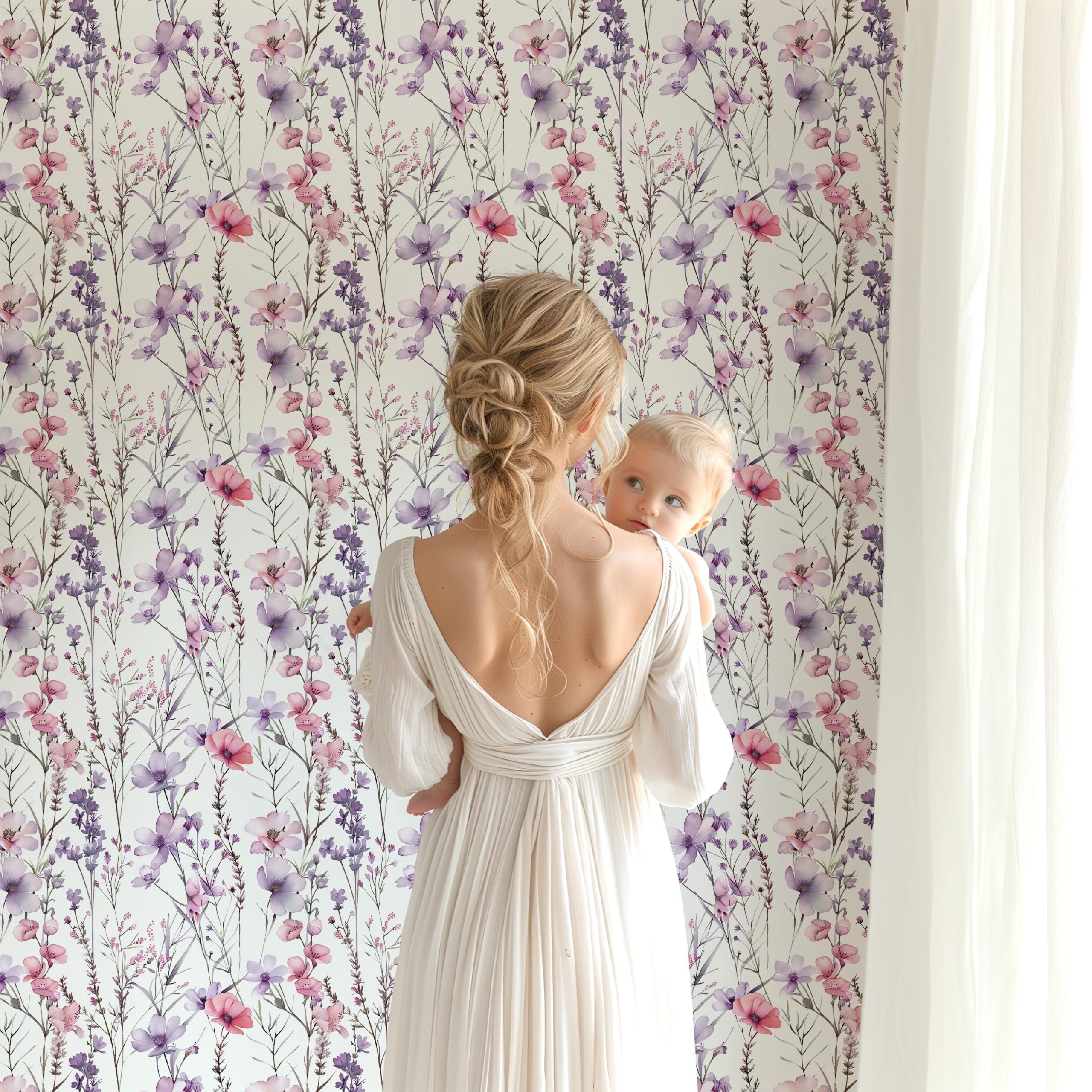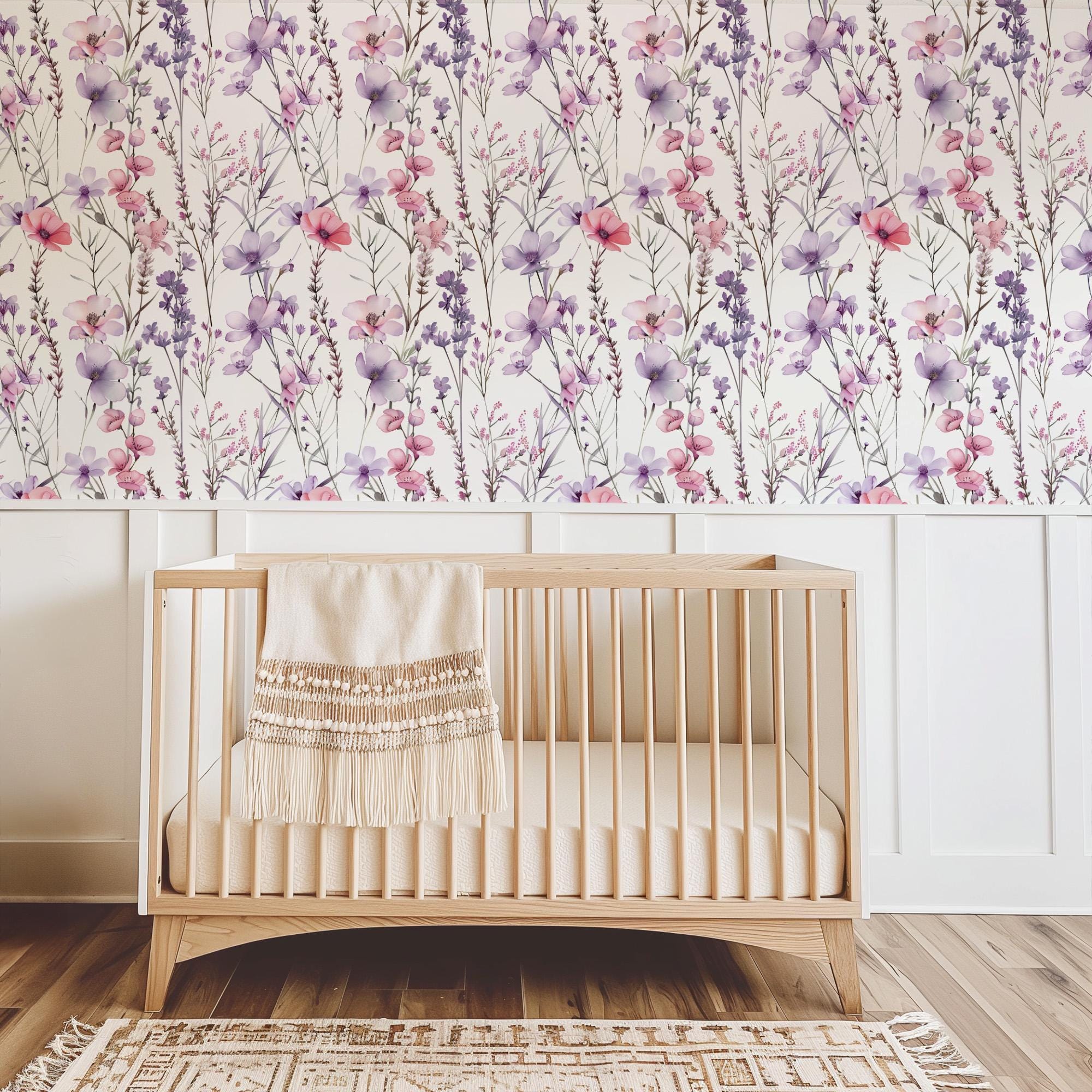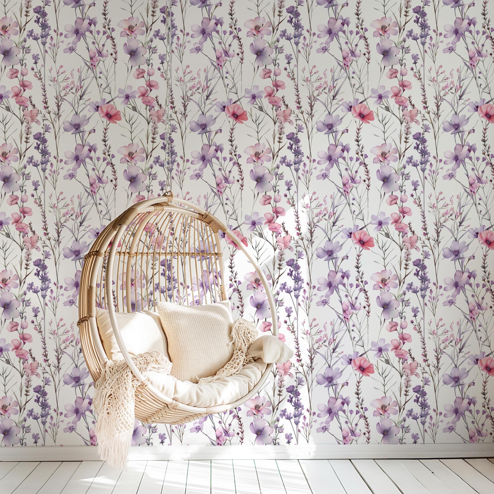 Purple Pink Wildflower Wallpaper, Peel Stick Removable, Baby Girl Toddler Room, Vintage Boho Chic Dainty, Lavender Floral Bedroom