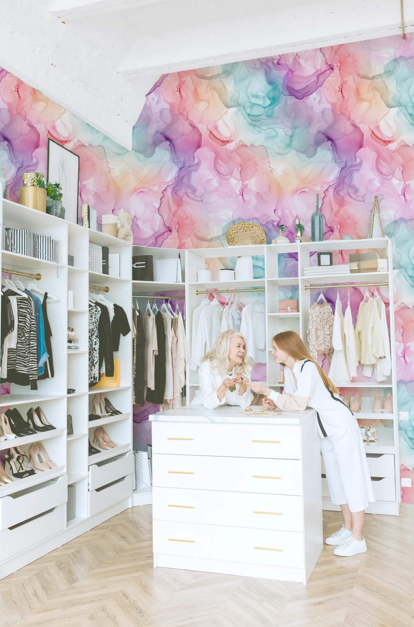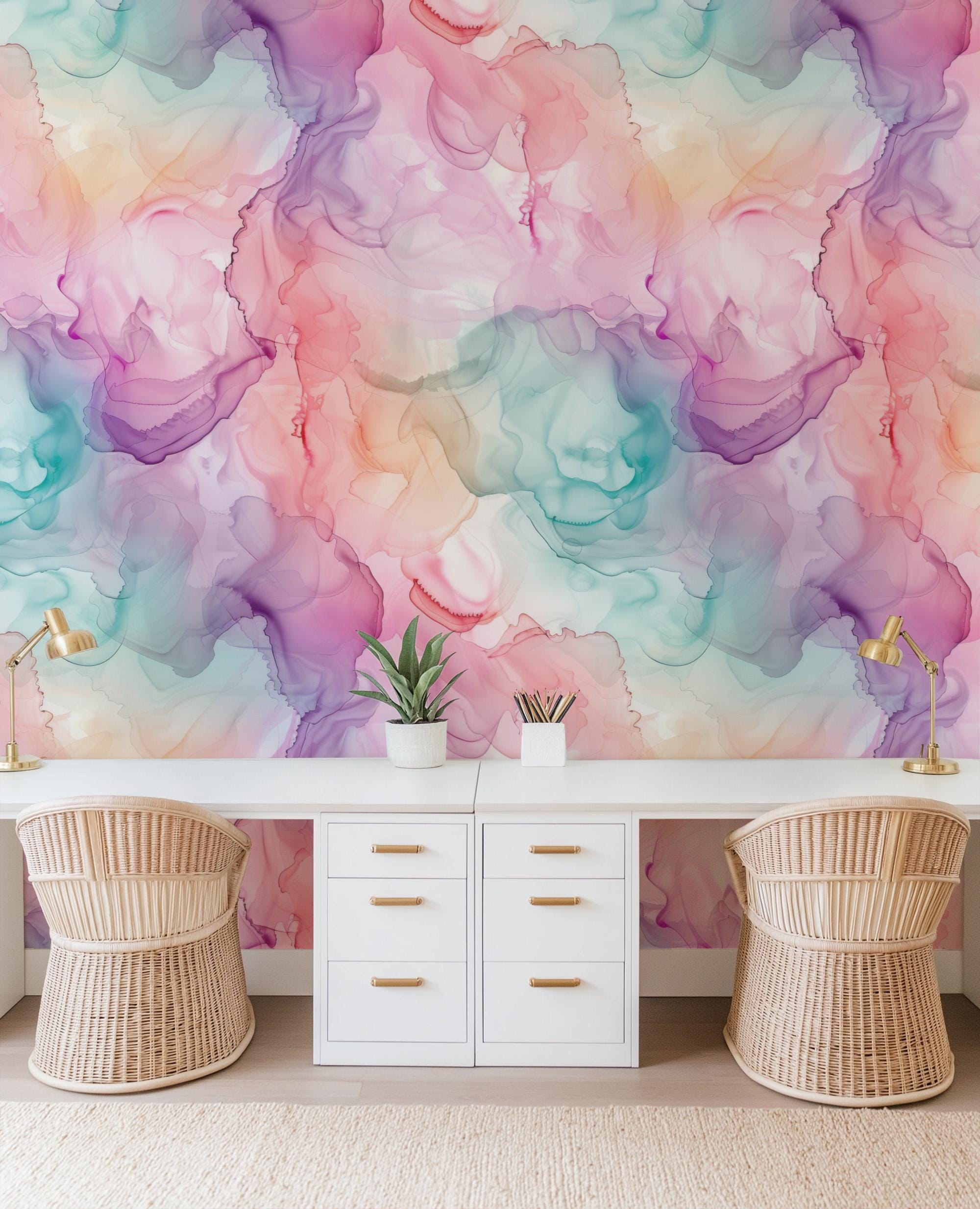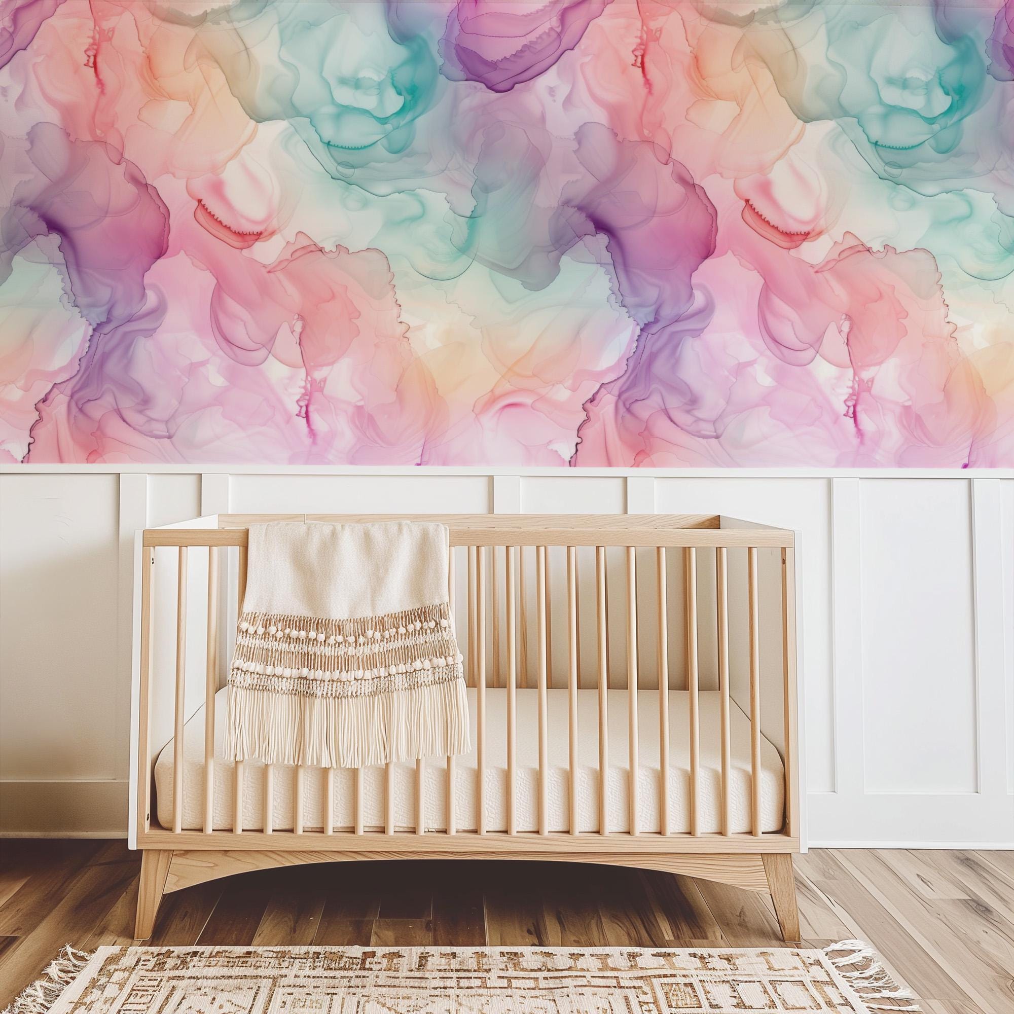 Rainbow Watercolor Swirls Wallpaper, Pink Blue Purple Ink Blend on Paper, Peel and Stick Removable, Prepasted Traditional Custom Sizes Girls