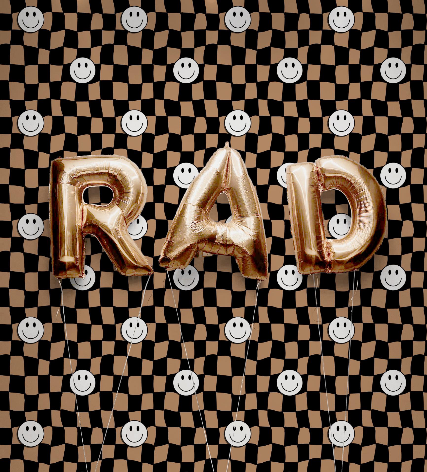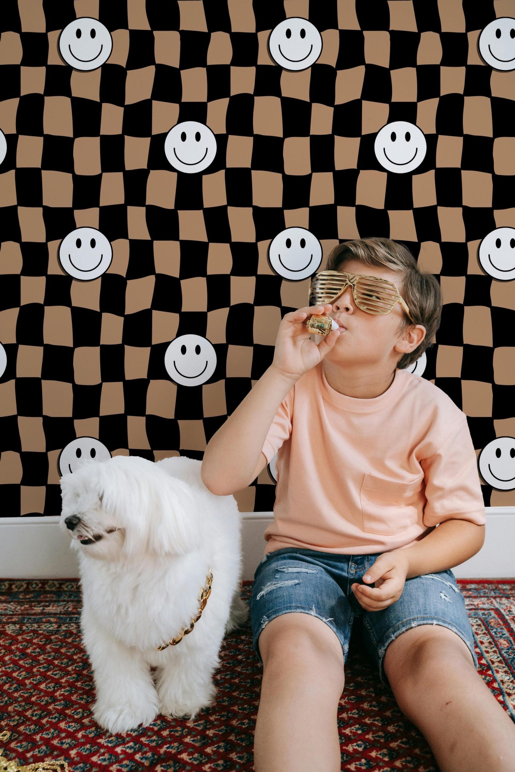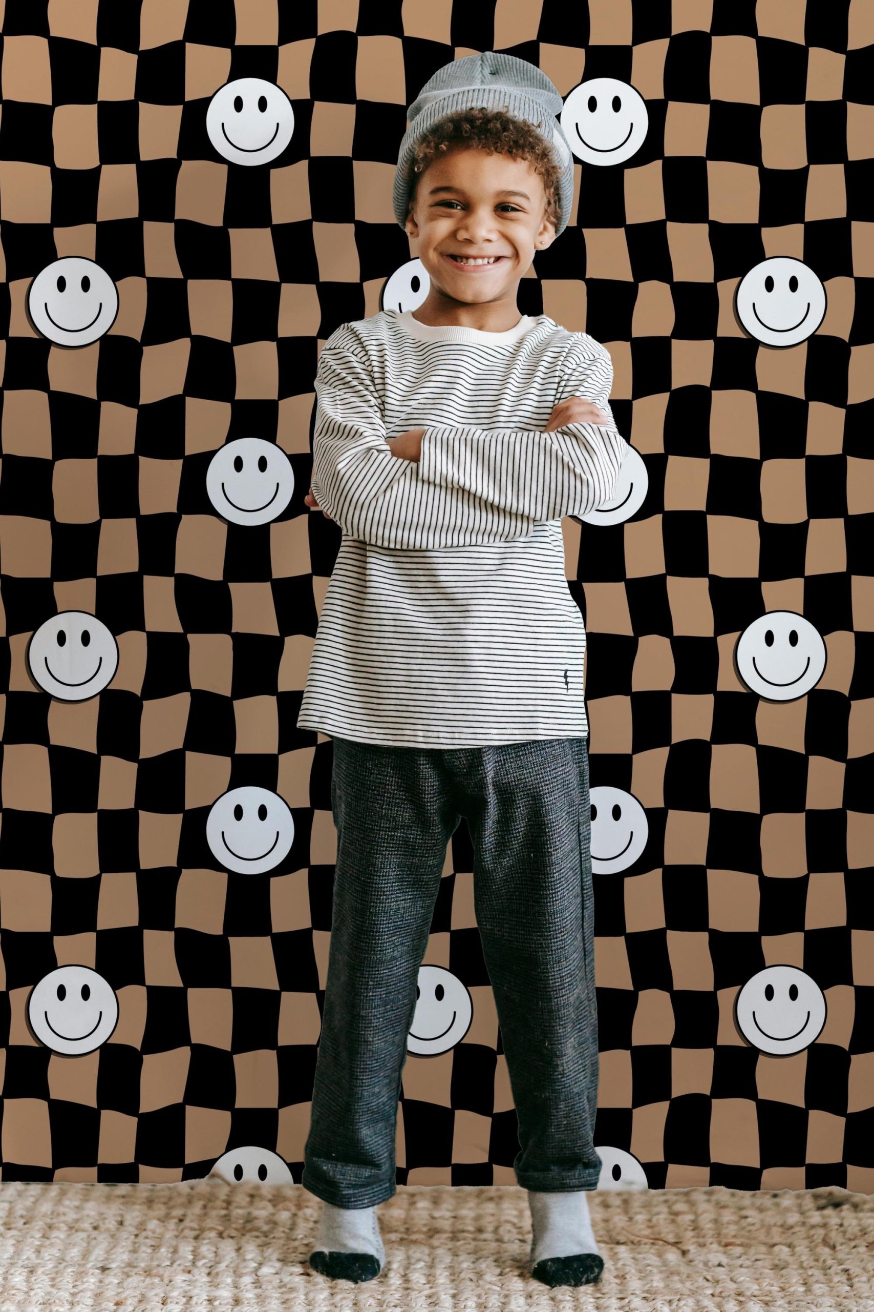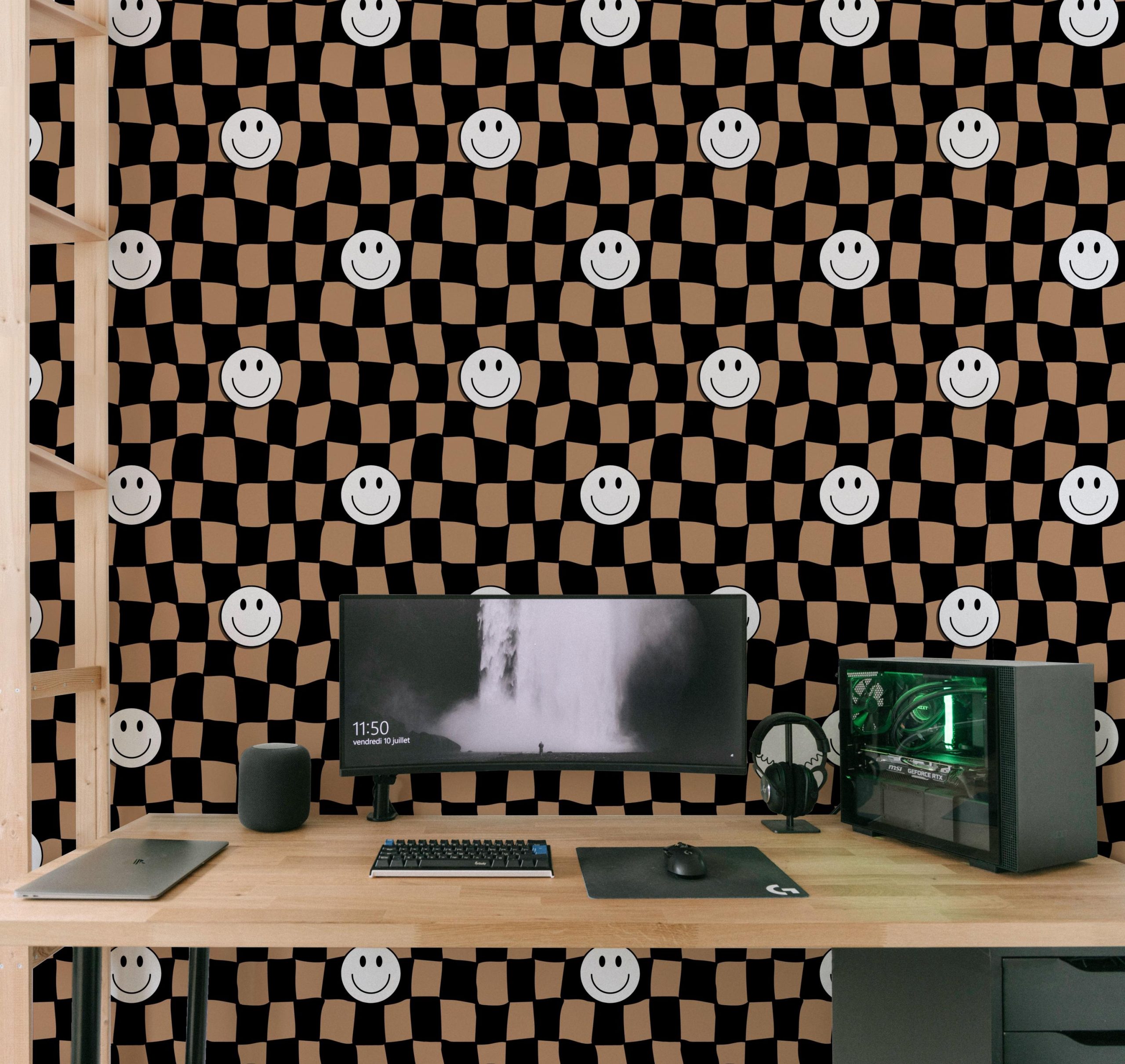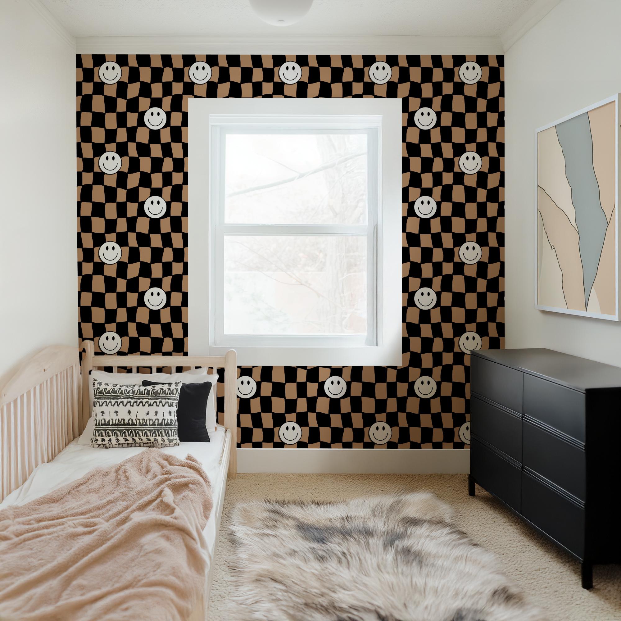 Smile Face Wavy Checkered Wallpaper, Check Wallpaper Tan Copper Black, Checkered Peel Stick Removable, Retro Rad Cool Kid Boys Room