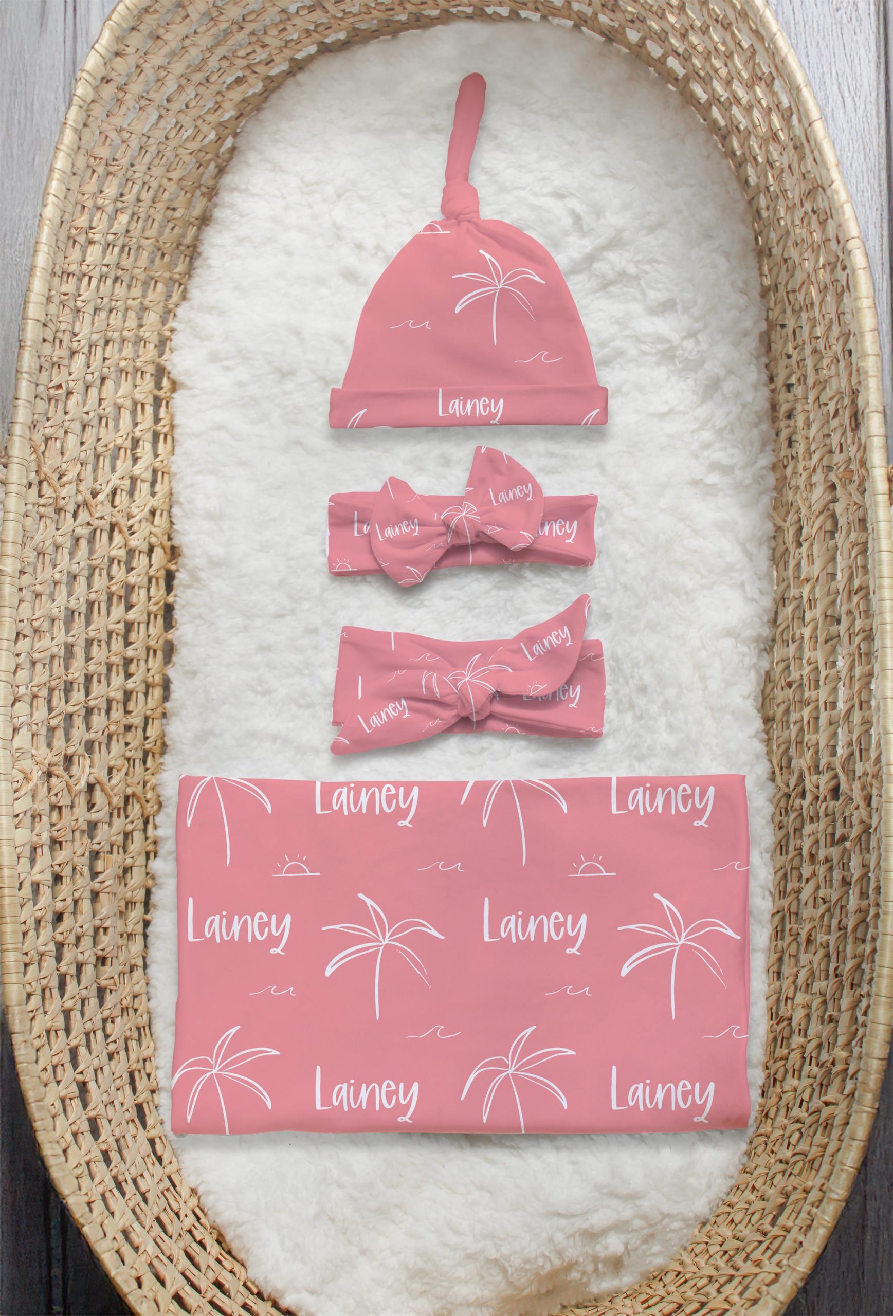 Tropical Palm Tree Swaddle Blanket Headband Hat Set / Personalized Baby Shower Gift / Hospital Newborn Photos Prop / Palm Collection