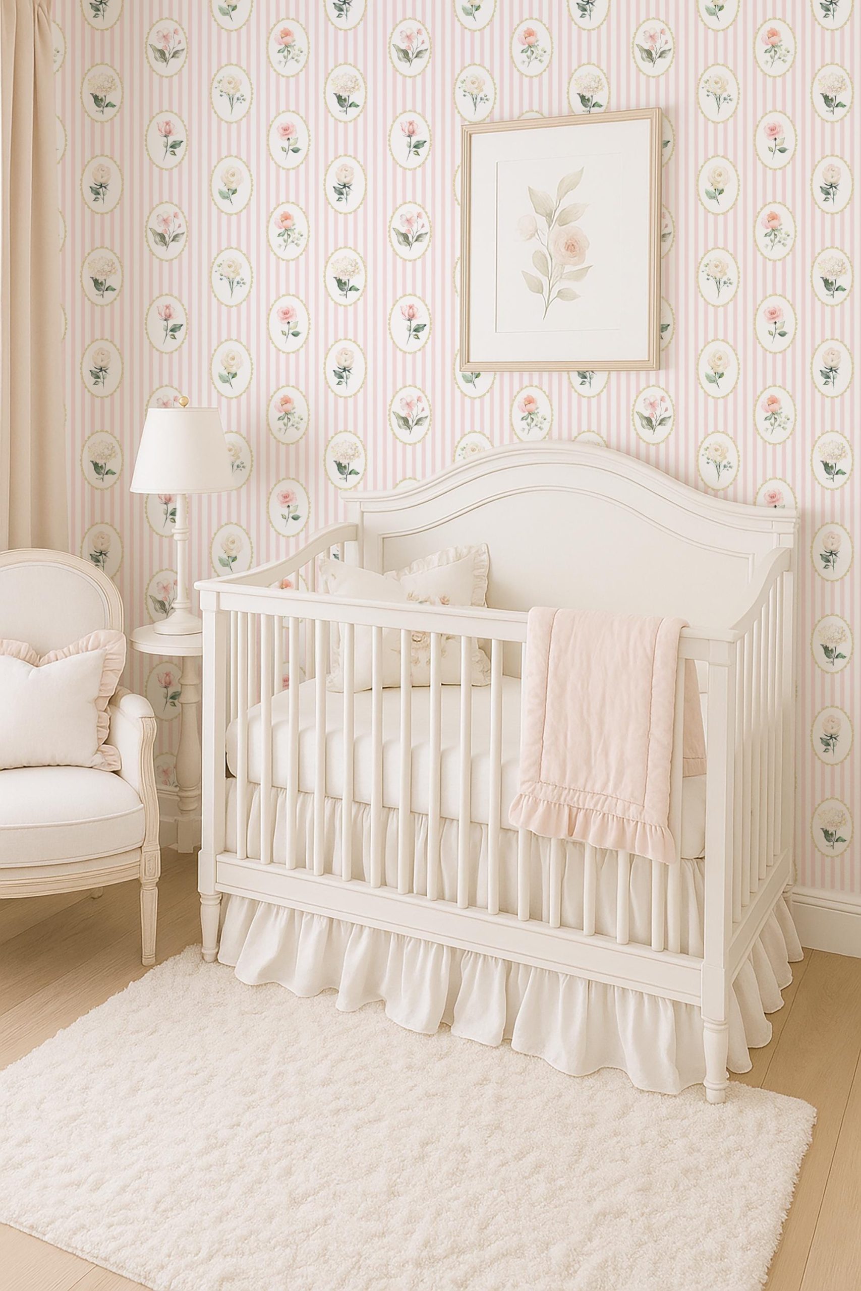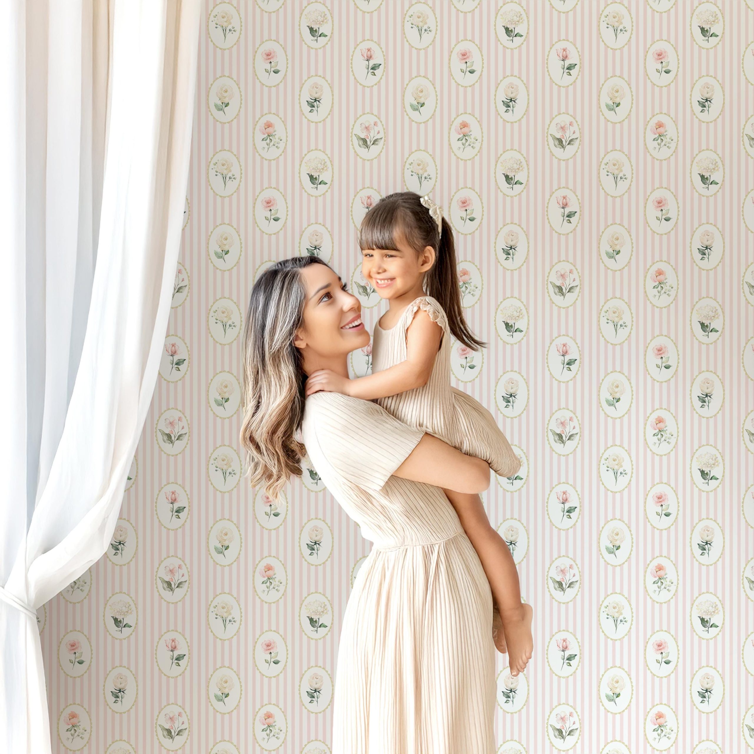 Step into a vintage dream with this pink striped cameo floral wallpaper 💗🌸 A blend of soft watercolor roses, scalloped gold frames, and classic vertical stripes — this wallpaper is ideal for coquette bedrooms, grandmillennial nurseries, or romantic vanity spaces.