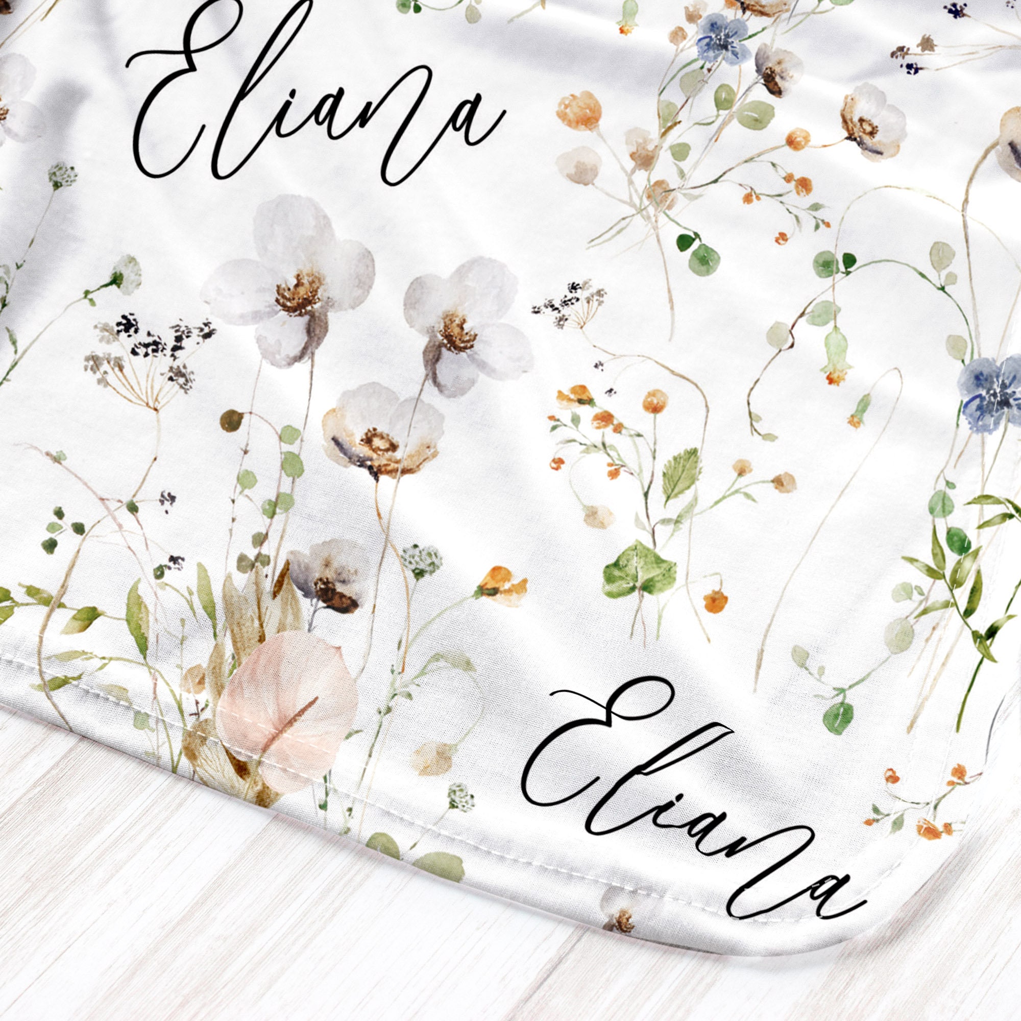 Infant swaddle collection featuring delicate wildflowers and baby’s name throughout. Personalized with your choice of our fonts. Swaddle, hat and headband all available.